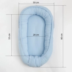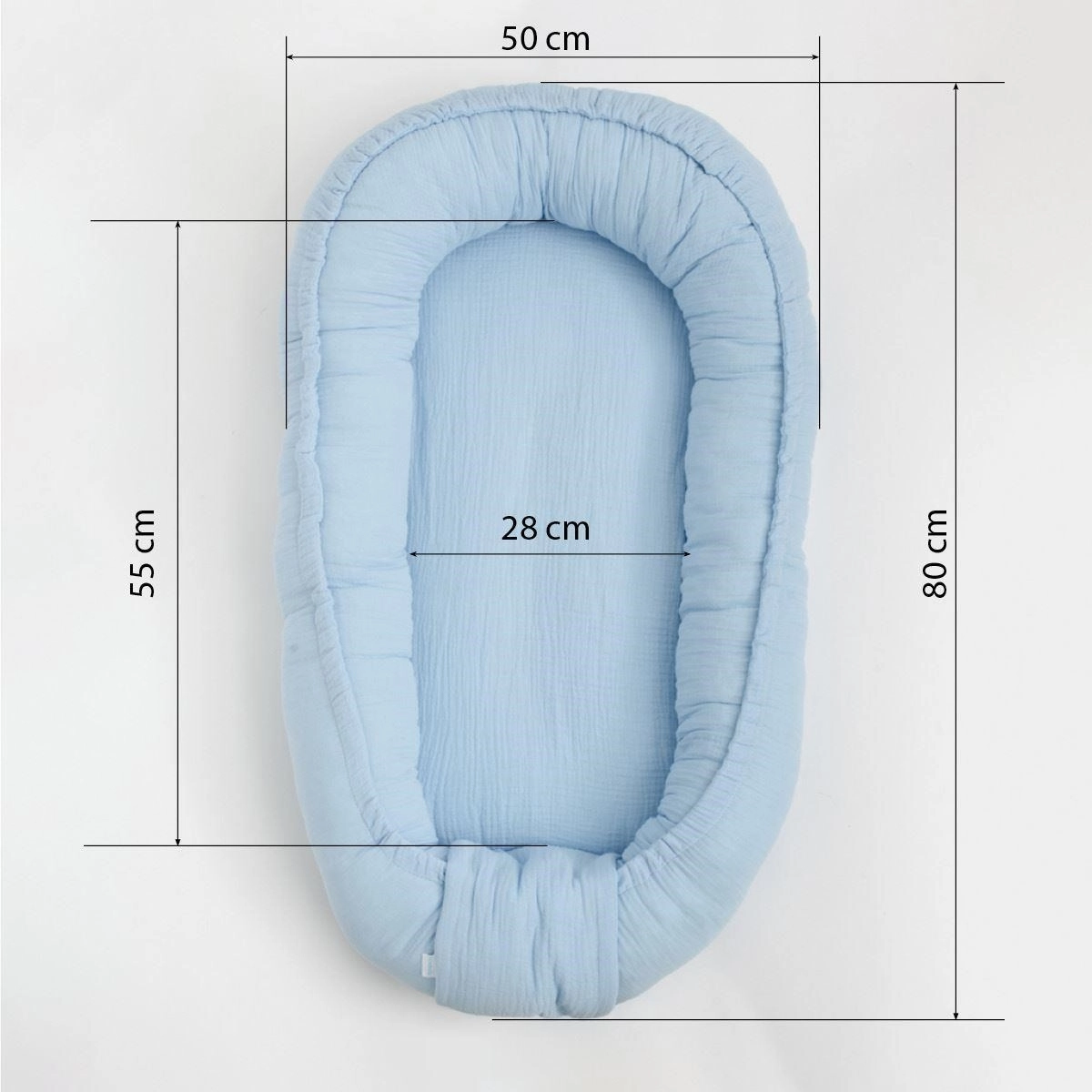 Gnijezdo je idealno za novorođenčad i dojenčad do 12 mjeseci. Tijekom putovanja osigurava poznato okruženje na koje je beba navikla, čime olakšava san i odmor izvan doma. Antialergijsko punjenje i kvalitetan pamuk nježni su prema osjetljivoj dječjoj koži.