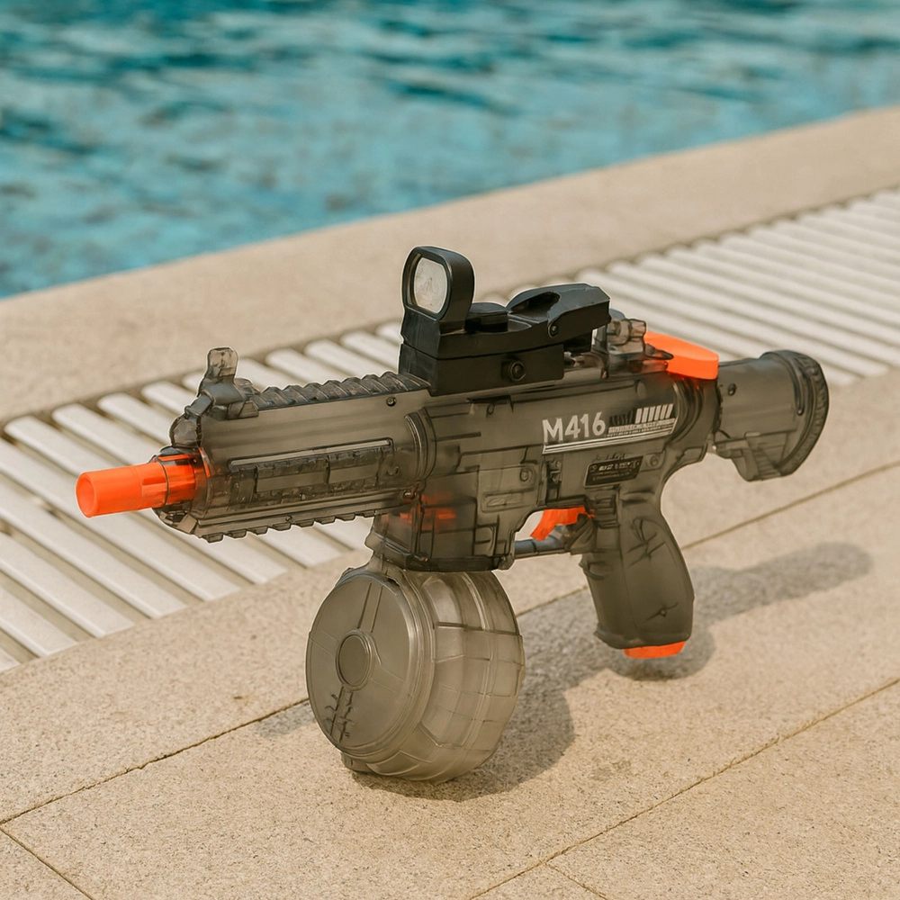 Električni vodeni pištolj M416 idealan je za vanjske bitke uz bazen, u vrtu i na plaži. Ergonomska drška, automatski pogon i veliki bubanj‑spremnik pružaju stabilne performanse bez stalnog pumpanja. Prozirno tijelo s narančastim sigurnosnim elementima izgleda moderno, a efektne LED na ustima cijevi dodaju dinamiku akciji.