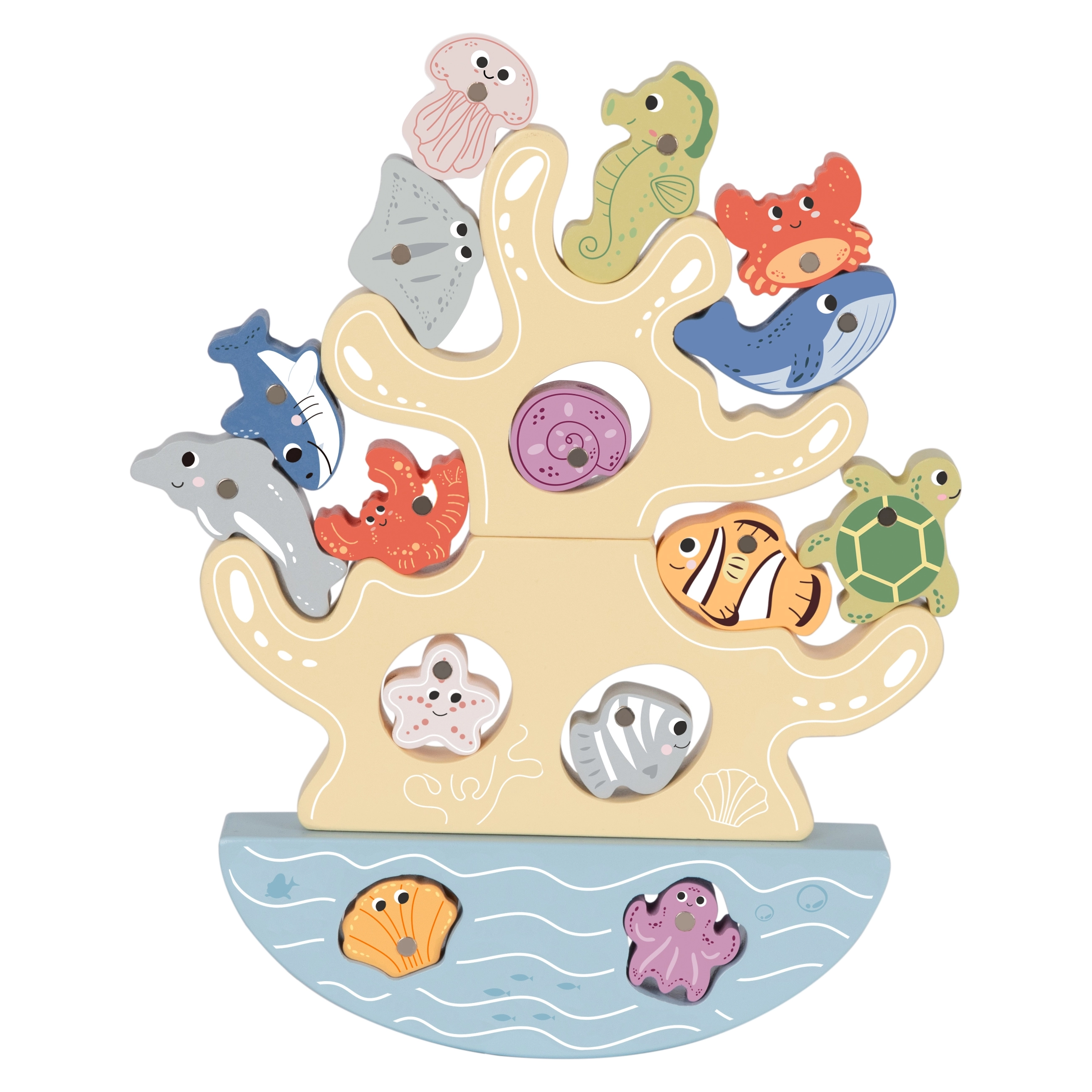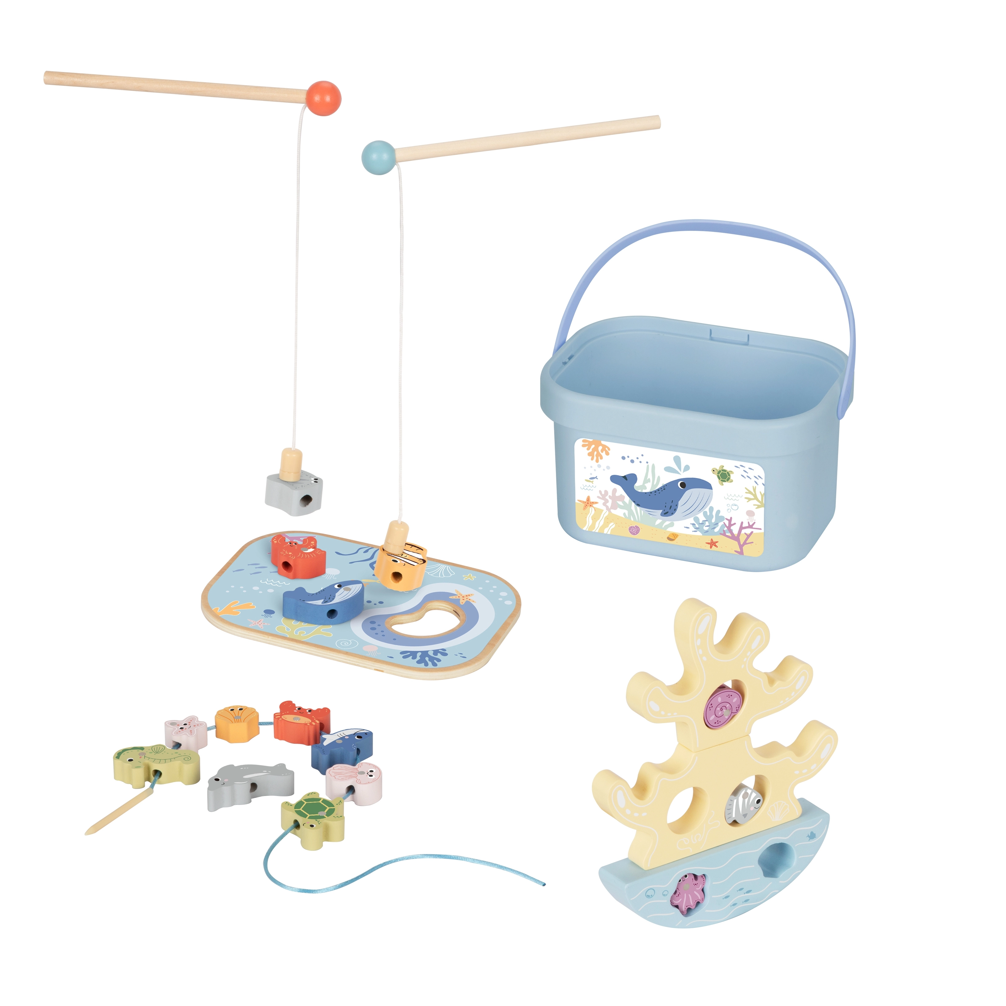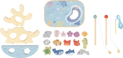 Ovaj kreativni drveni set donosi djeci čitav ocean zabave u jednom pakiranju. Dva magnetska štapa mame na lov šarenih ribica, koraljni balansirajući toranj vježba strpljenje i stabilnost, a uzica za nizanje s drvenom iglom razvija finu motoriku i koncentraciju. Dijelovi imaju ugodno zaobljene rubove i dobro leže u dječjoj ruci.