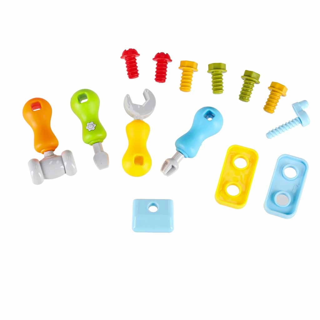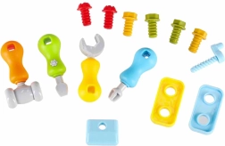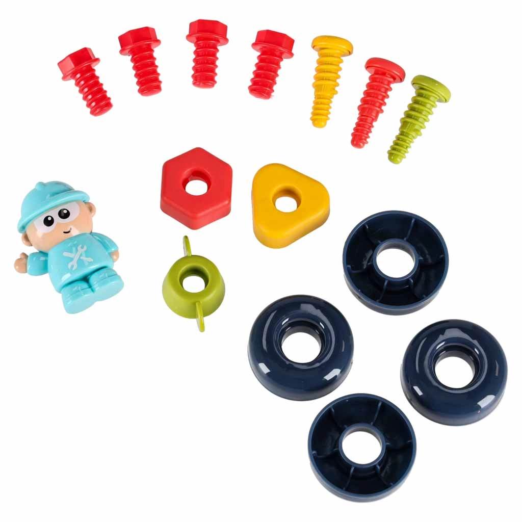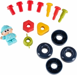 Set sadrži vijke, matice, zupčanike, odvijače, ključ i čekić. Djeca vježbaju preciznost i koordinaciju pri pričvršćivanju dijelova i učenju oblika.