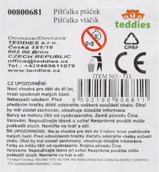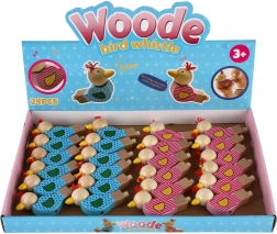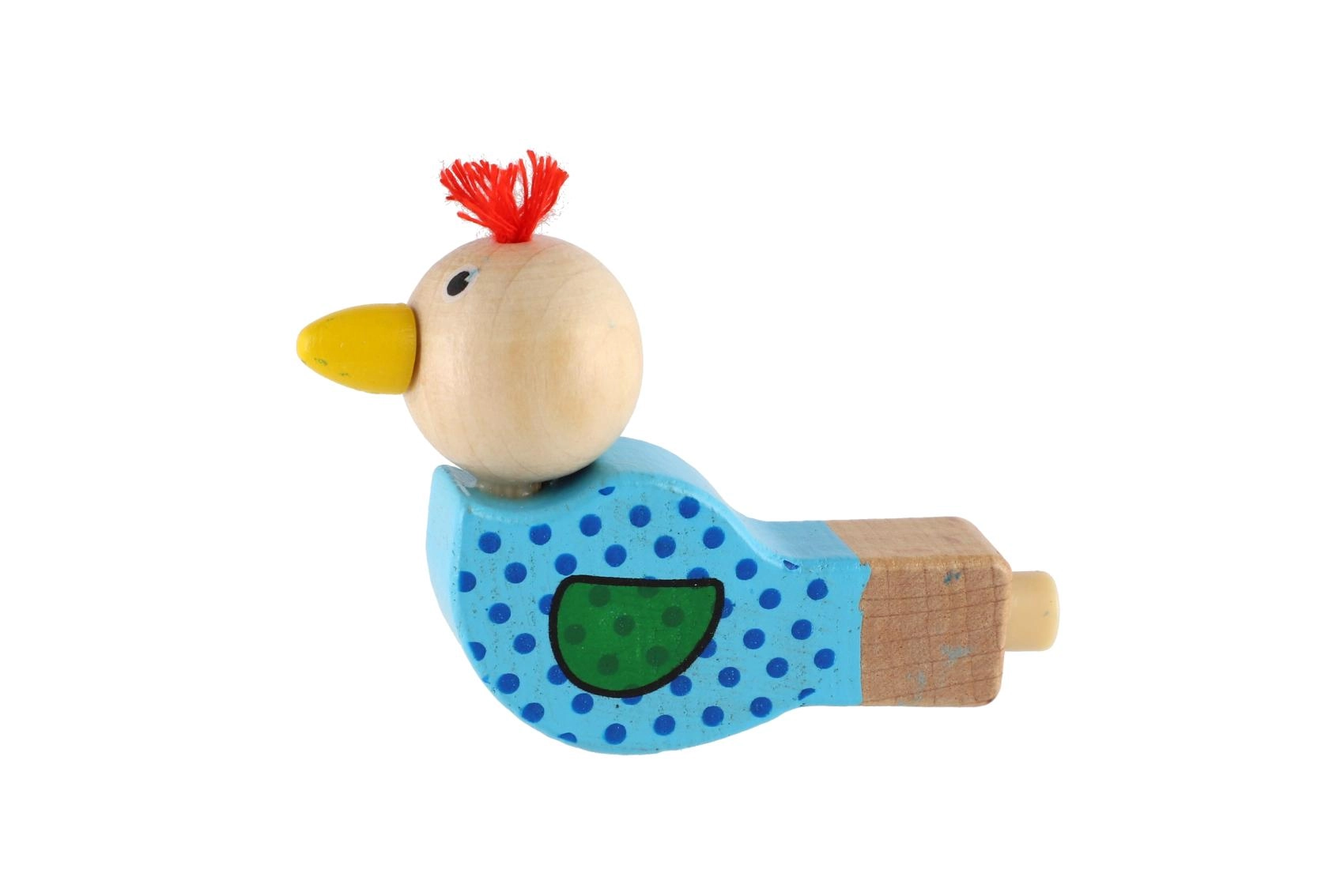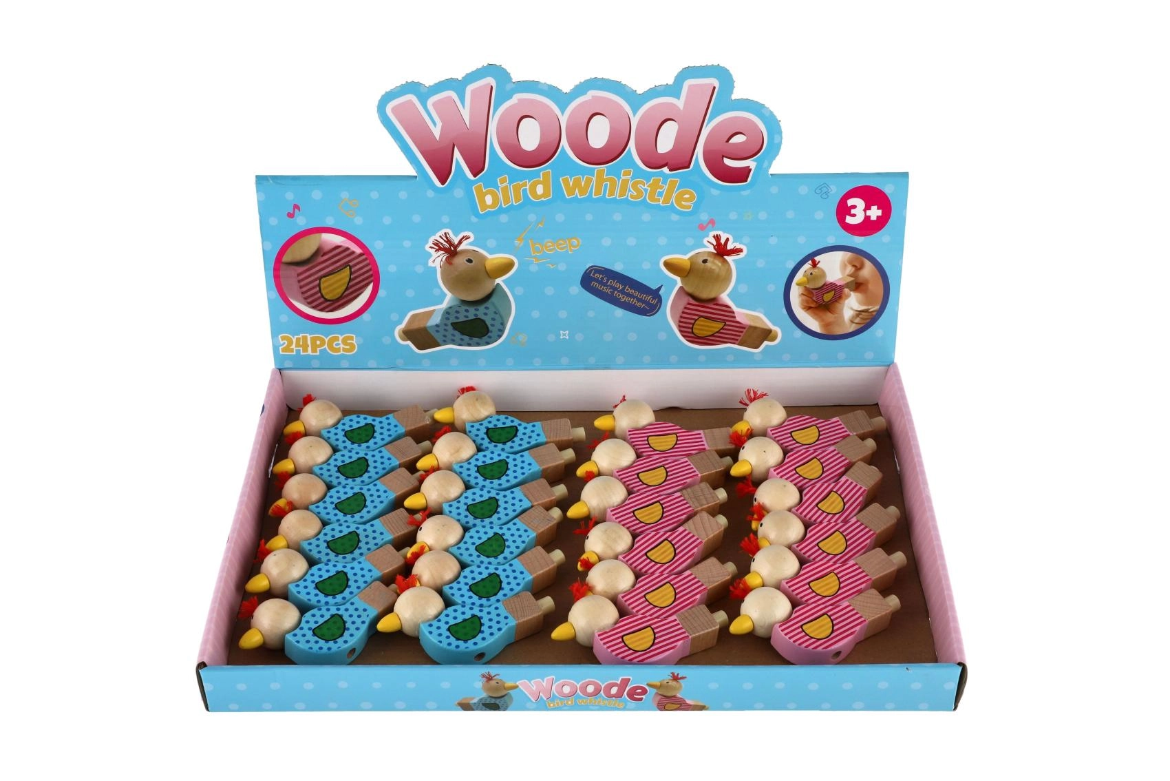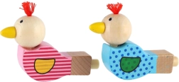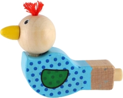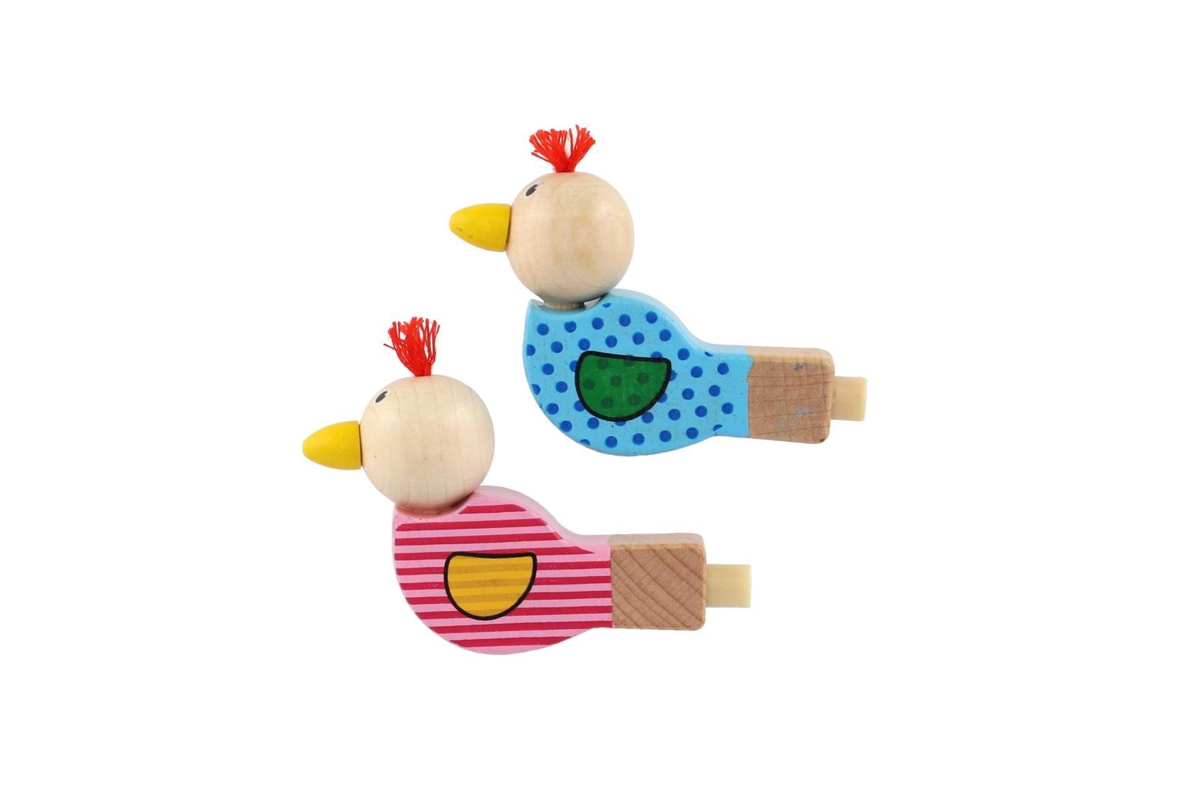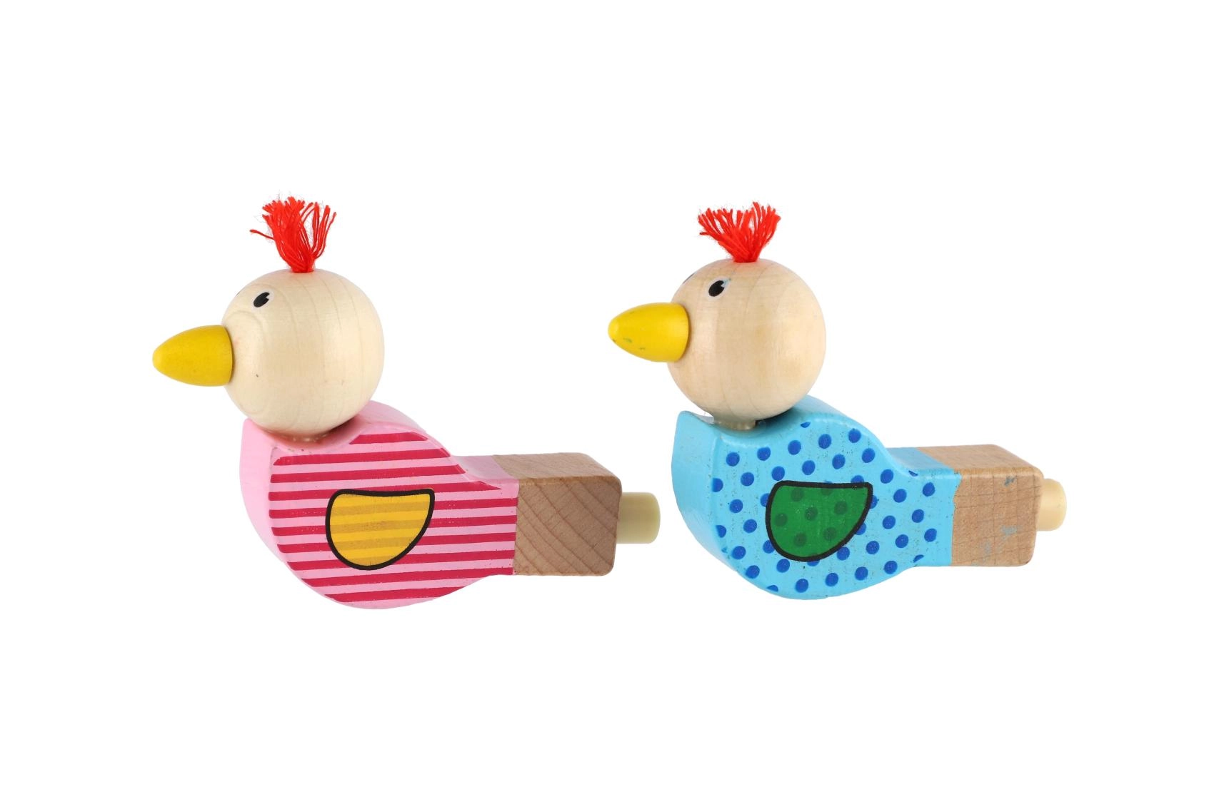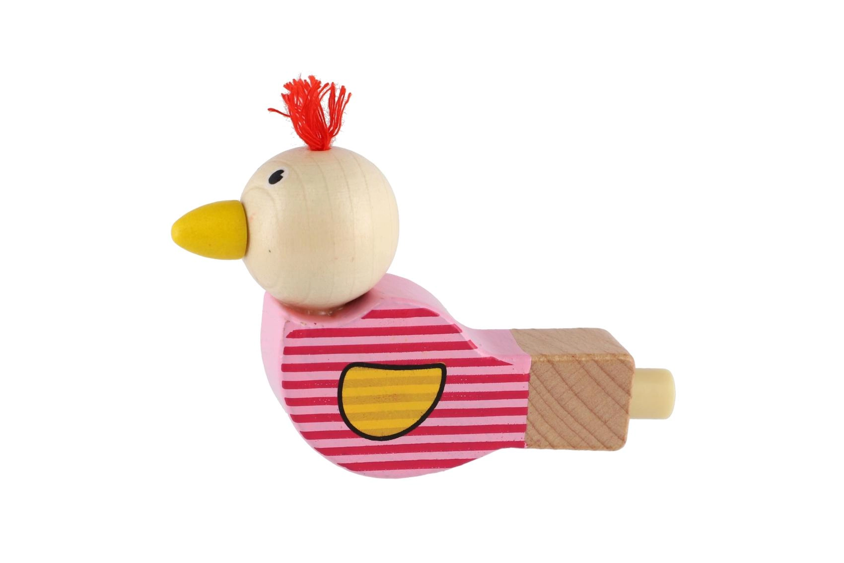 Zviždaljka je izrađena od kvalitetnog drva i ukrašena veselim motivima u ružičastoj i plavoj varijanti. Mali kićanko na glavi ptičice daje igrački poseban karakter. Odlična je kao mali poklon, nagrada ili dodatak dječjoj party vrećici.