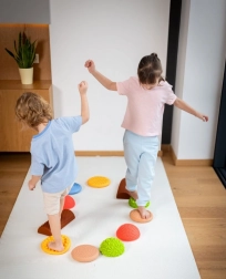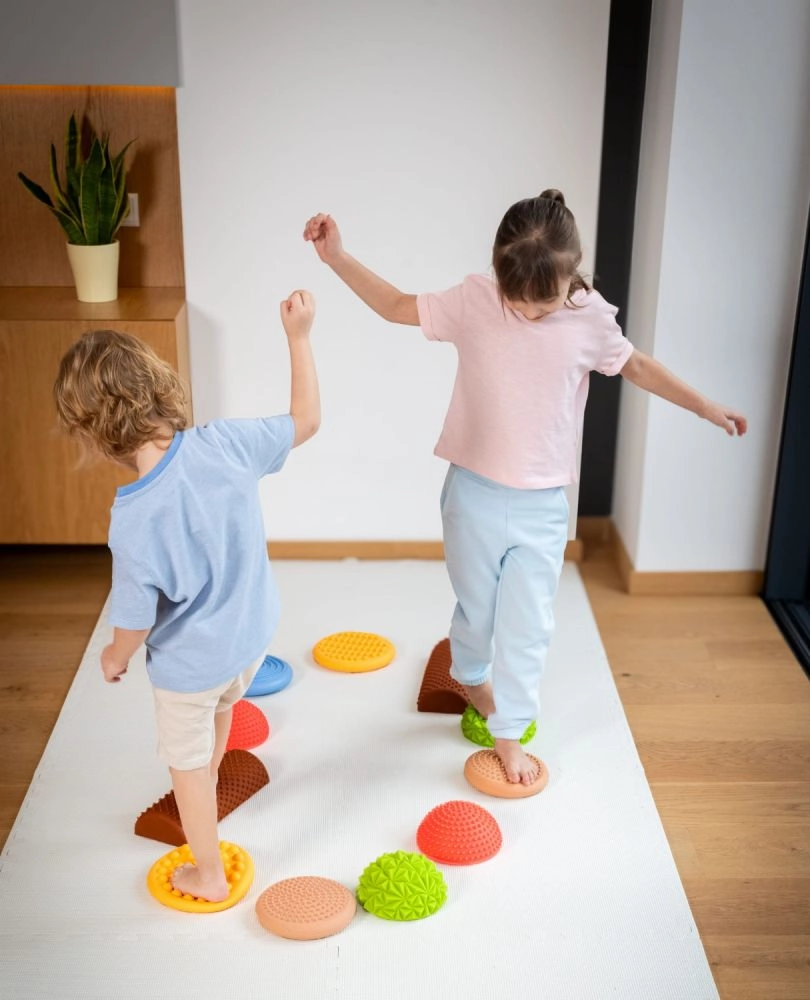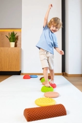 Set sadrži kombinaciju polukupola, diskova i poluvaljaka koje se mogu slobodno rasporediti u ravne linije ili igraće krugove. Zahvaljujući čvrstoj, ali elastičnoj konstrukciji i protukliznoj obradi dijelovi su sigurni na ravnim podovima i na podlogama za vježbanje. Prikladno za kućno vježbanje, vrtiće, škole, fizioterapiju i senzornu integraciju.