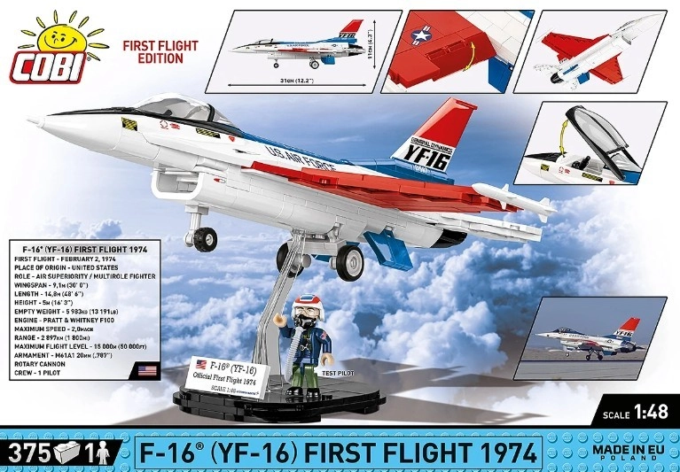 Sastavite legendu američkog zrakoplovstva – prototip YF‑16 First Flight 1974 od 375 dijelova u mjerilu 1:48. Model ima otvorivu kabinu, pokretne zakrilce i stajni trap, kvalitetan tampotis US AIR FORCE i uključuje figuricu pilota s maskom. Elegantno prezentacijsko postolje s pločicom daje kolekcionarski štih.