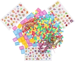 Dio pakiranja su kvadratni elementi, plastične perlice raznih oblika i boja, elastične gumice i pjenaste naljepnice za stvaranje jedinstvenog stila. Sjajan izbor za kućno kreativno stvaranje, dječje proslave i kao poklon.