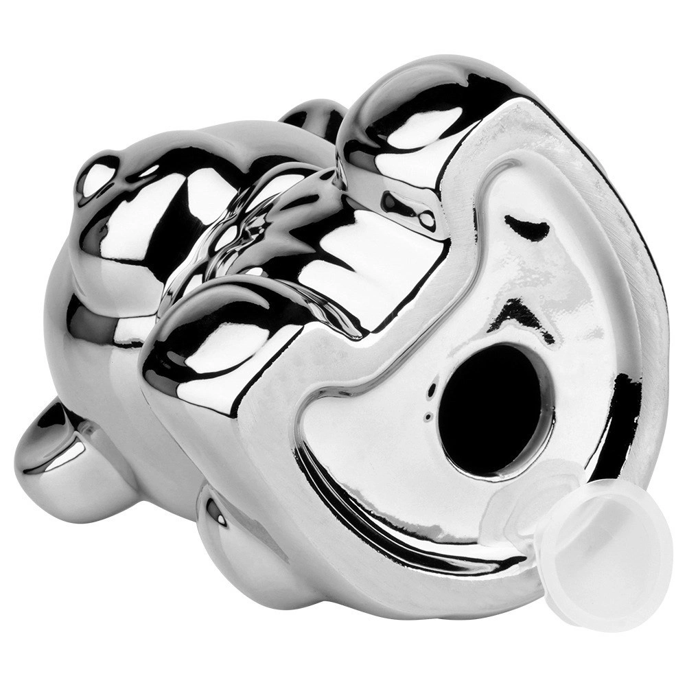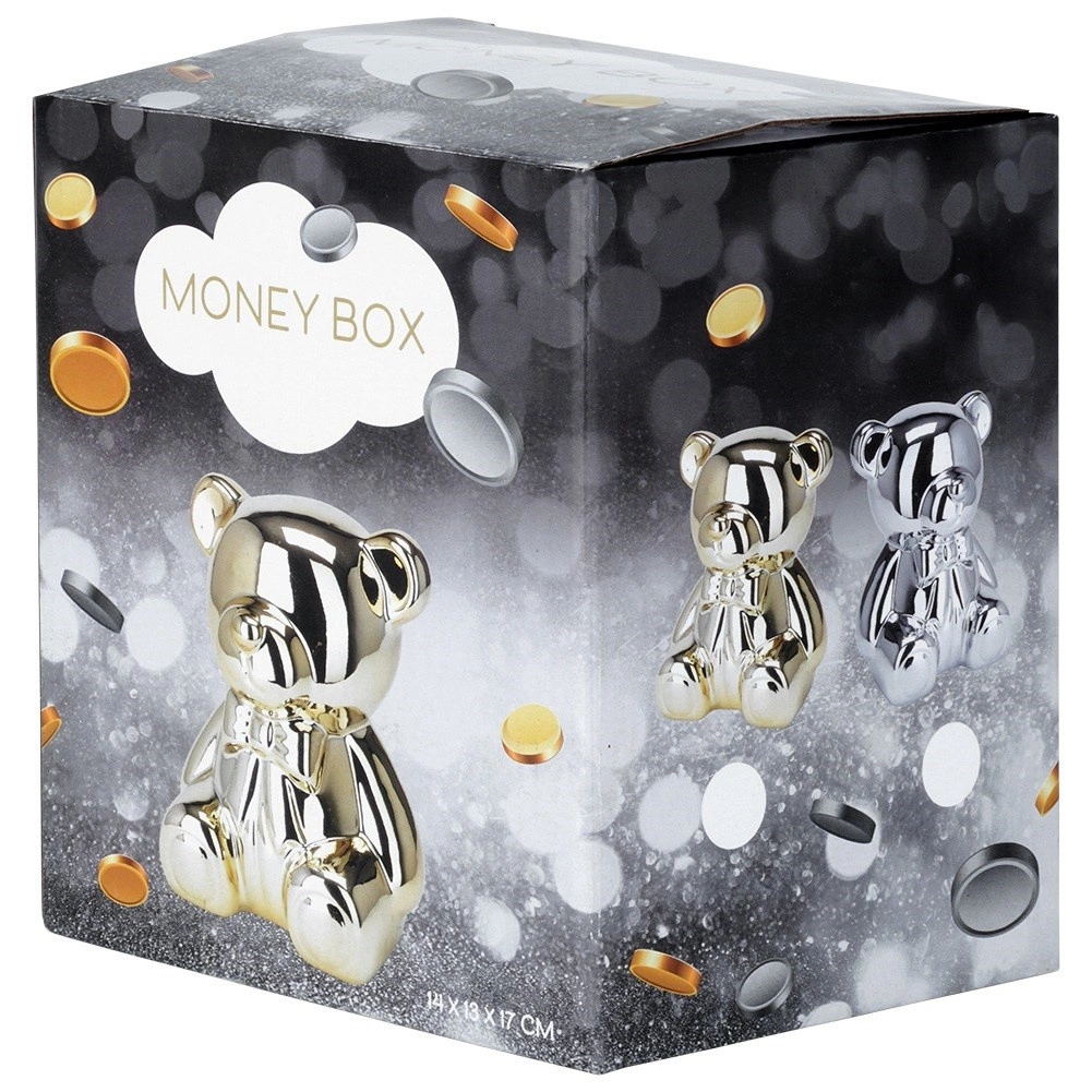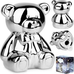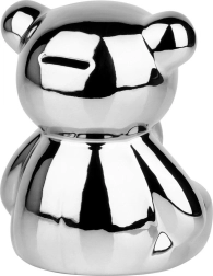 Ova srebrna keramička kasica u obliku mede spaja moderan glamur dizajn s praktičnom uporabom. Zrcalni sjaj daje interijeru notu luksuza i ujedno motivira na redovitu štednju kovanica i novčanica.
