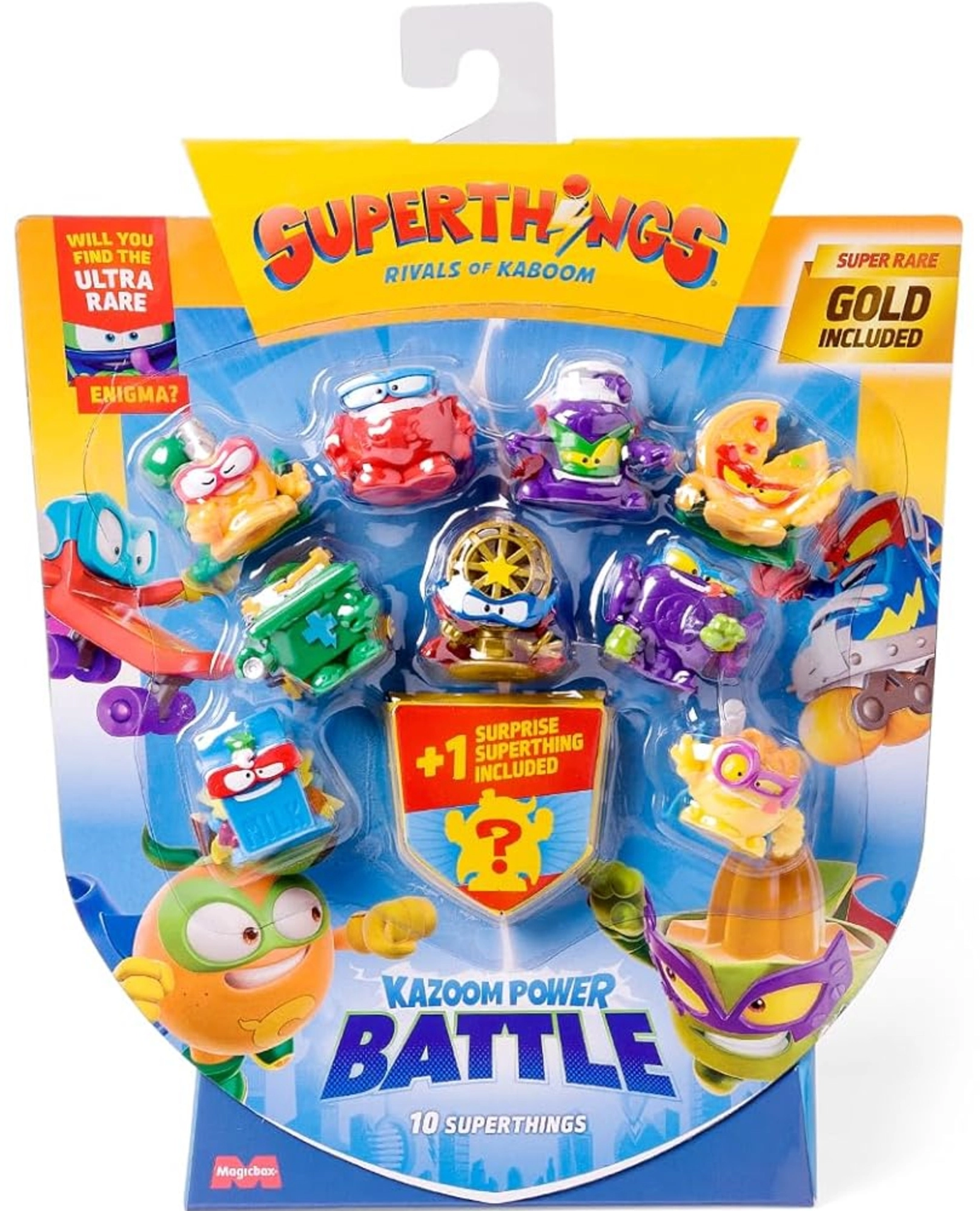 Set SuperThings Kazoom Power Battle donosi dinamičnu zabavu za male kolekcionare. U pakiranju se nalazi 9 različitih figurica i dodatno 1 tajanstvena figurica, koja može biti obična, rijetka ili iznimno rijetka. U cijeloj seriji dostupno je preko 80 likova – hoće li vam se posrećiti i pronaći super rijetku figuricu Enigme?