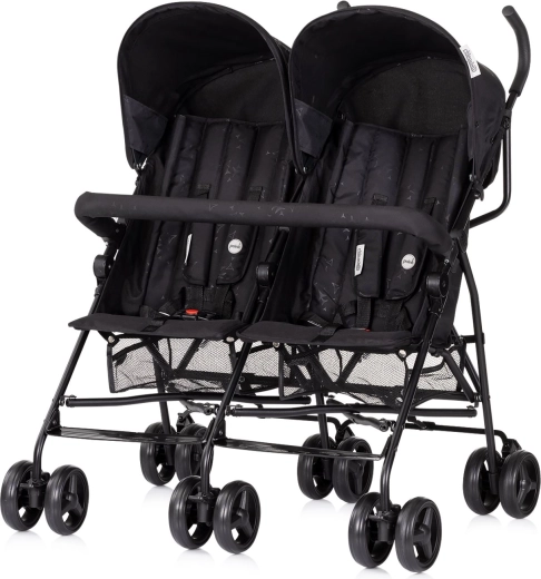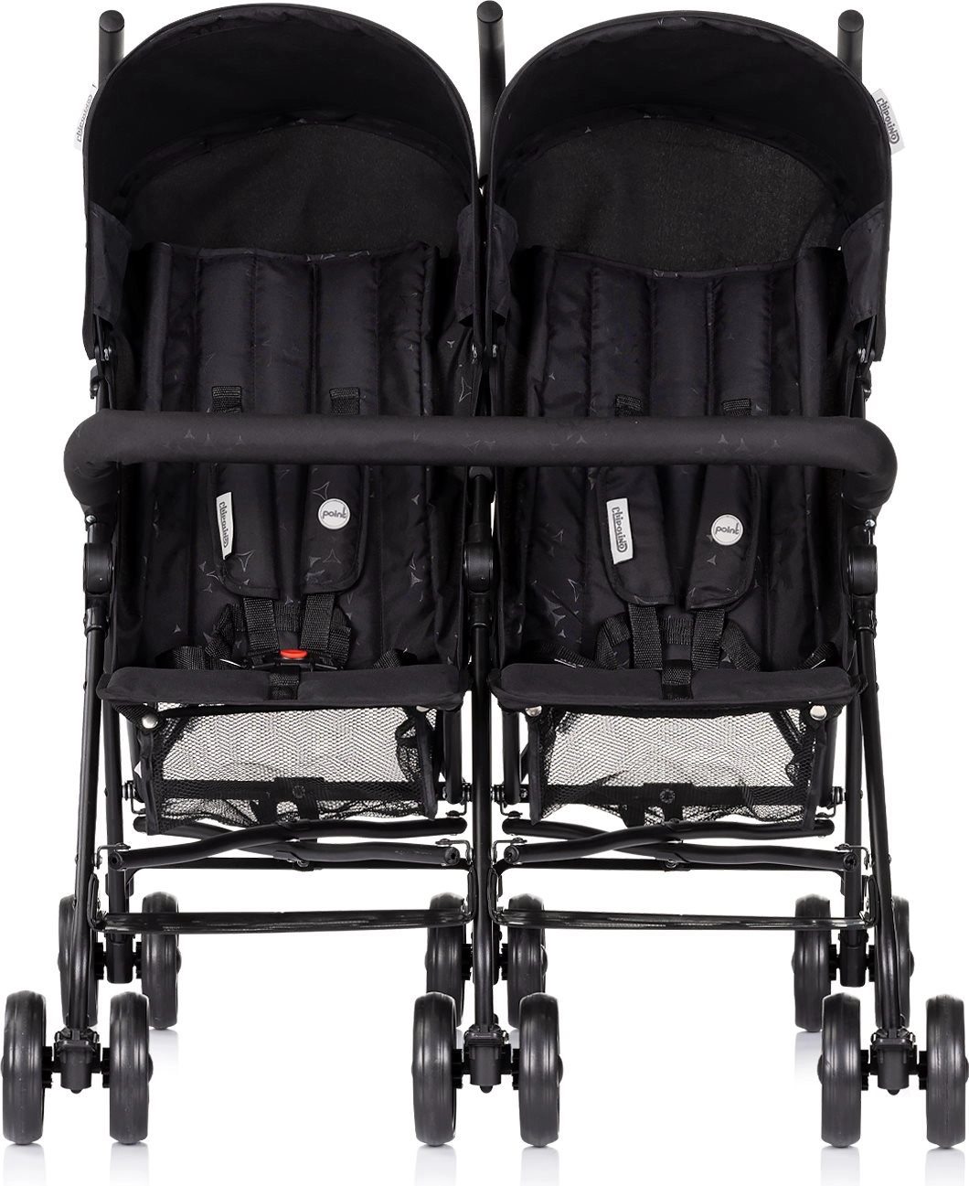Chipolino Double Point Blackberry praktična su i pouzdana kolica za dvoje djece jedno pored drugog. Lagan okvir i kompaktno „kišobran“ sklapanje olakšavaju prijevoz i spremanje, dok podesivi nasloni i mekano podstavljeni petotočkasti pojasevi pružaju djeci sigurnost i udobnost. Preklopivi krovići štite od sunca, a zajednička prednja prečka dodaje dodatnu razinu sigurnosti.