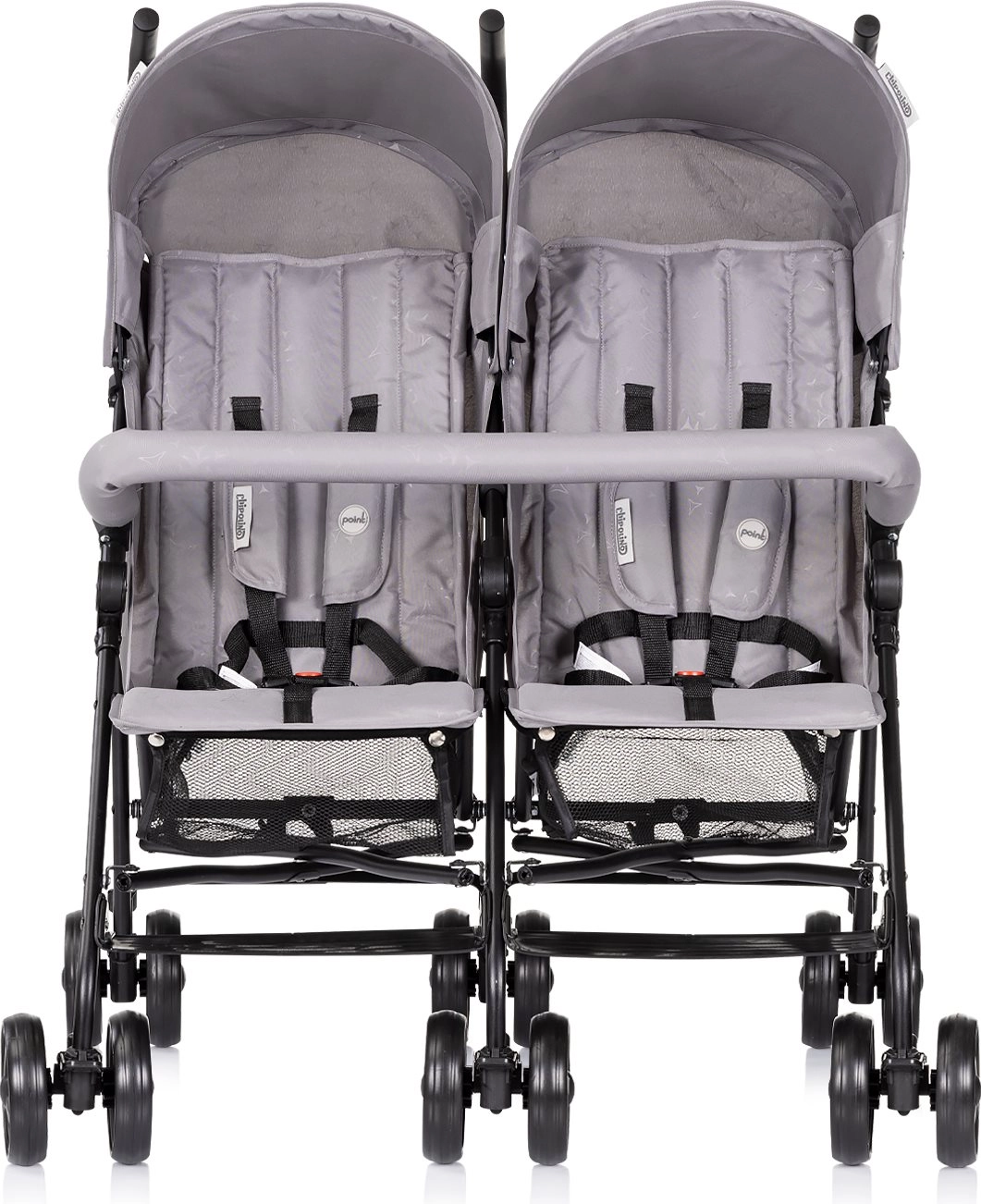 Kolica za blizance CHIPOLINO Double Point kombiniraju lagan klasičan okvir s promišljenom opremom za udobnost djece i roditelja. Zahvaljujući sjedalima postavljenima jedno uz drugo oba mala putnika imaju dovoljno prostora, a sigurnost osiguravaju 5-točkovni pojasevi s mekanim podstavama i zajednička prednja sigurnosna prečka. Sklopive krošnje štite od sunca i vjetra, dok velika košara za odlaganje prima sve potrebno za put.