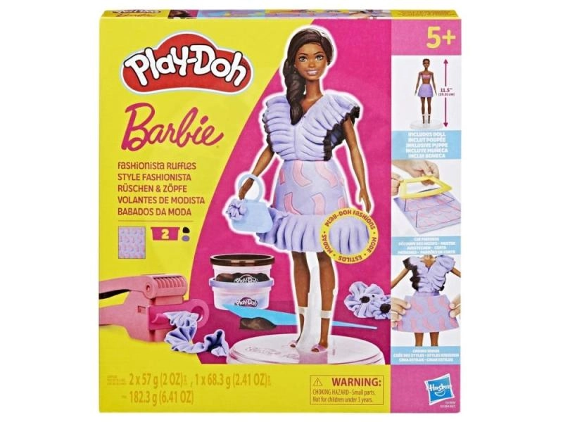 Ovaj Play-Doh set za lutku Barbie donosi sve što djeci treba za izradu vlastitih modnih kreacija i frizura. Lutku jednostavno postavite na stalak, pomoću šablone i kalupa izradite haljine, dodate dodatke i u trenu je lutka zvijezda modnih pista. Zahvaljujući dvjema vrstama kalupa za kratku i dugu kosu može se isprobavati nove stilove uvijek iznova.