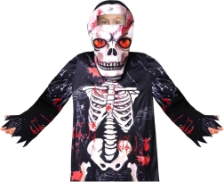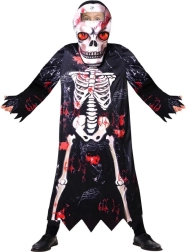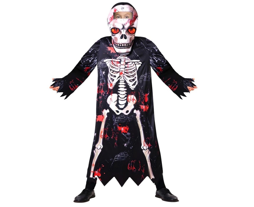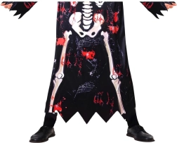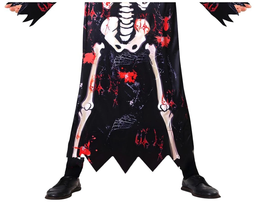 Dječji kostim kostura idealan je za Halloween, karneval, školske priredbe i tematske zabave. Crni plašt s printom kostiju i efektno “poderanim” rubovima stvara autentičan dojam, dok se kapuljača i maska lako stavljaju i osiguravaju pouzdano prekrivanje lica.