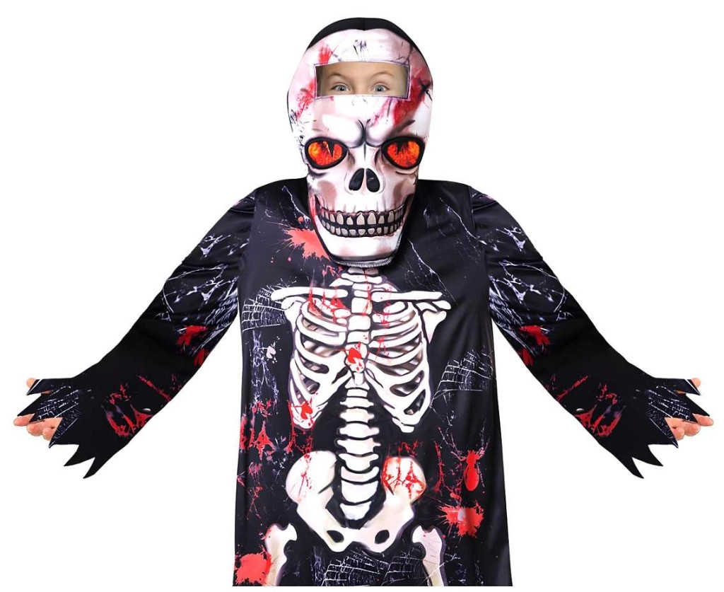 Zahvaljujući laganom materijalu, kostim je udoban za nošenje i omogućuje slobodno kretanje pri igri i plesu. Upečatljiv kontrastni print kostiju s crvenim akcentima djetetu daje jeziv, a istovremeno zabavan look bez zahtjevnog šminkanja.