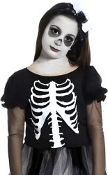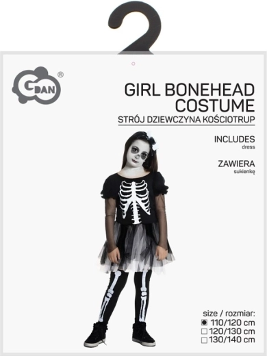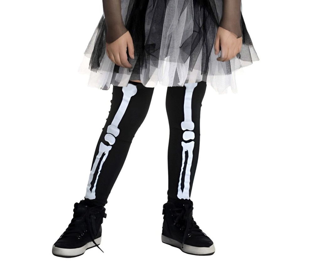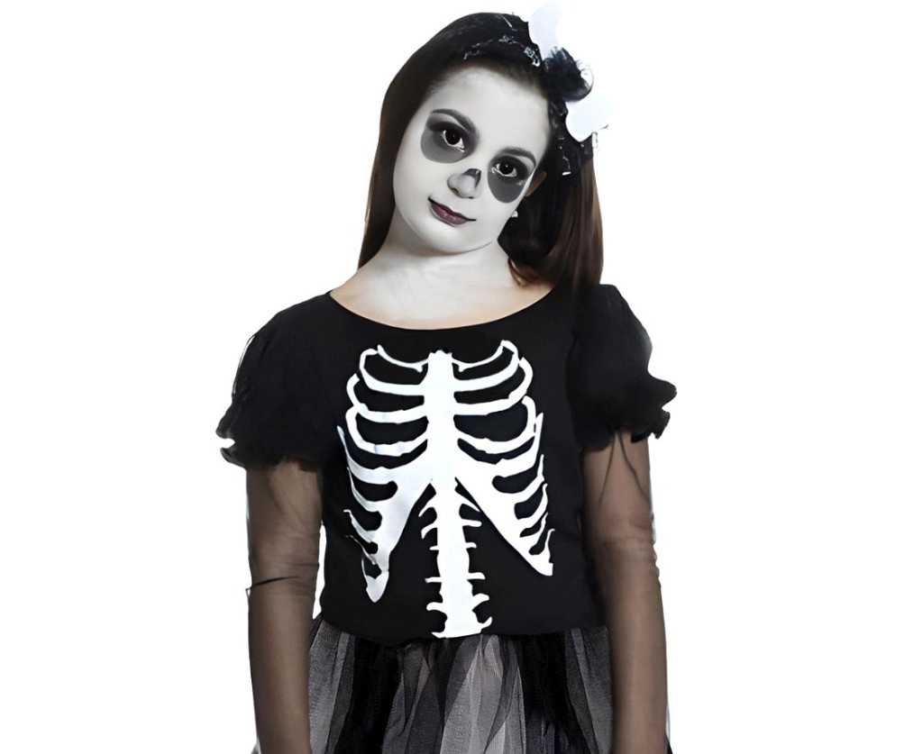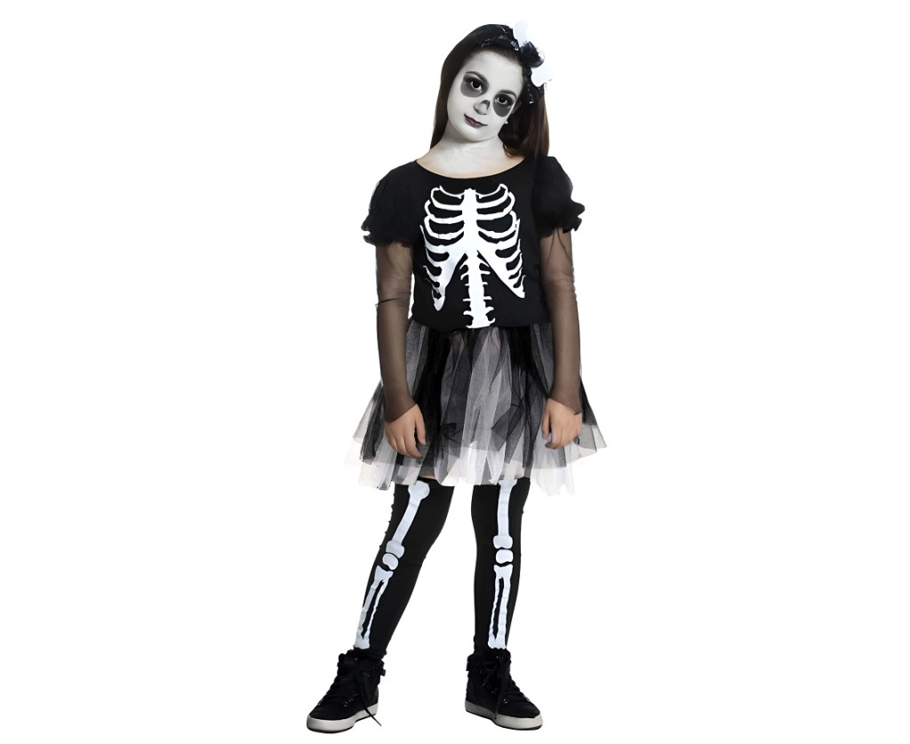 Ostavite dojam na svakoj proslavi s ovim stilskim djevojačkim kostimom kostura. Crne haljine s izraženim otisnutim kosturom, prozirnim balon rukavima i slojevitom tyl suknjom stvaraju dojmljiv, a ujedno udoban outfit za malo strašilo.