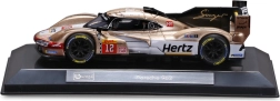 Ovaj visokodetaljan model Porschea 963 u mjerilu 1:43 donosi autentičan izgled izdržljivostnog trkaćeg specijala s službenim trkaćim otiscima, realističnim proporcijama i aerodinamičnim elementima uključujući izraženo stražnje krilo i difuzor. Zlatno-bijela trkaća shema s logotipovima sponzora (npr. Hertz, Mobil 1, DHL) naglašava vrhunski trkaći karakter.