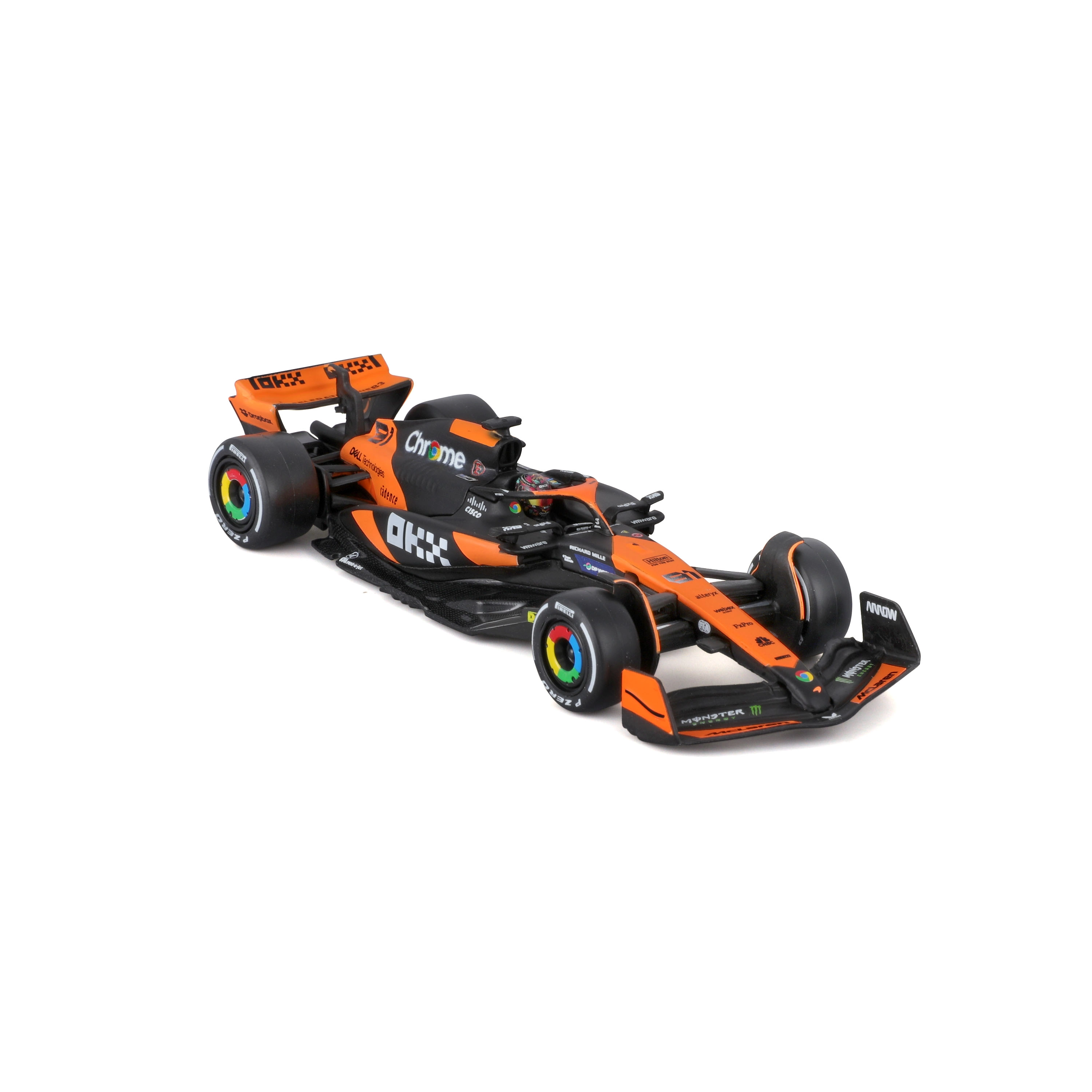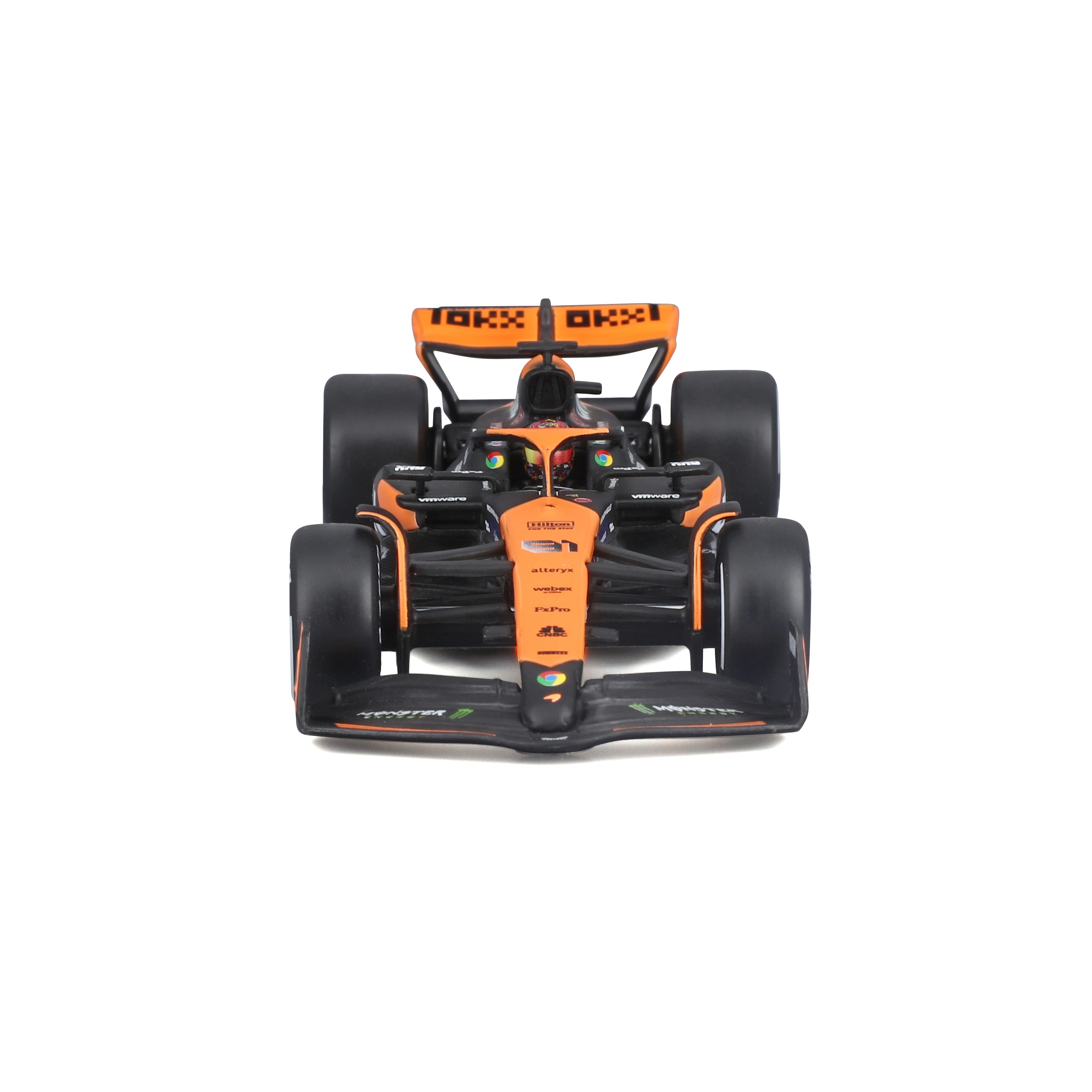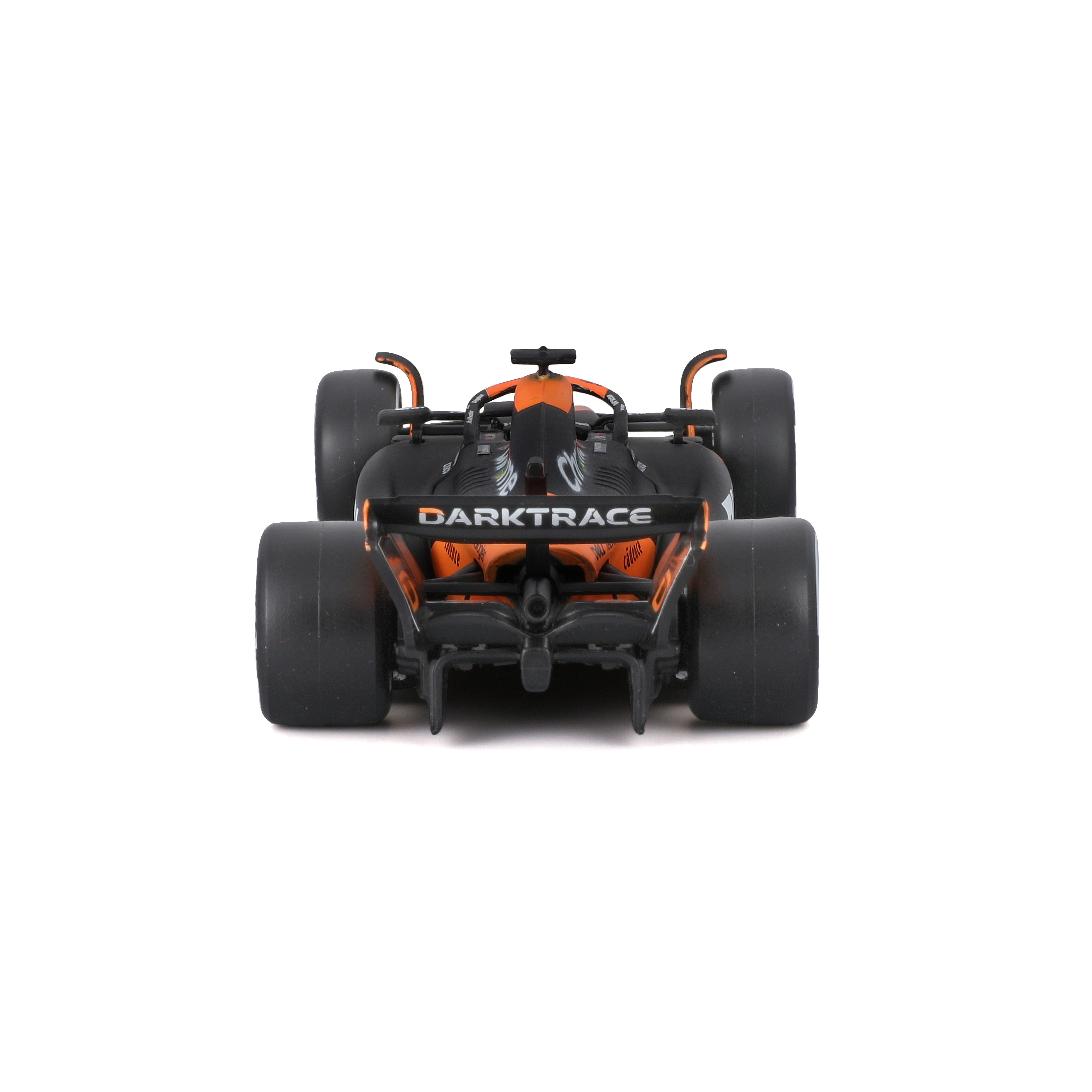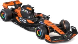 Vjerno narančasto‑crno bojanje, precizni timski logotipi i obojene glavčine kotača naglašavaju trkaći karakter pravog F1 bolida.