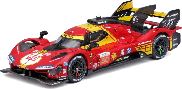 Model donosi precizne trkaće naljepnice, startni broj 50 i ikonično crveno bojanje Ferrarija sa žutim akcentima – točno onako kako je automobil trijumfirao u Le Mansu.