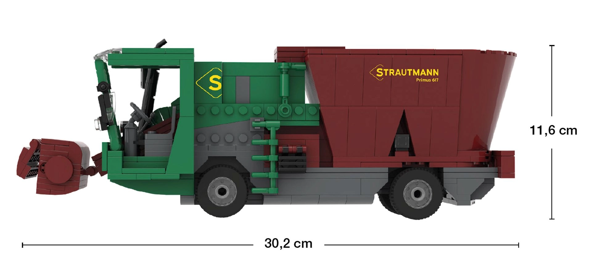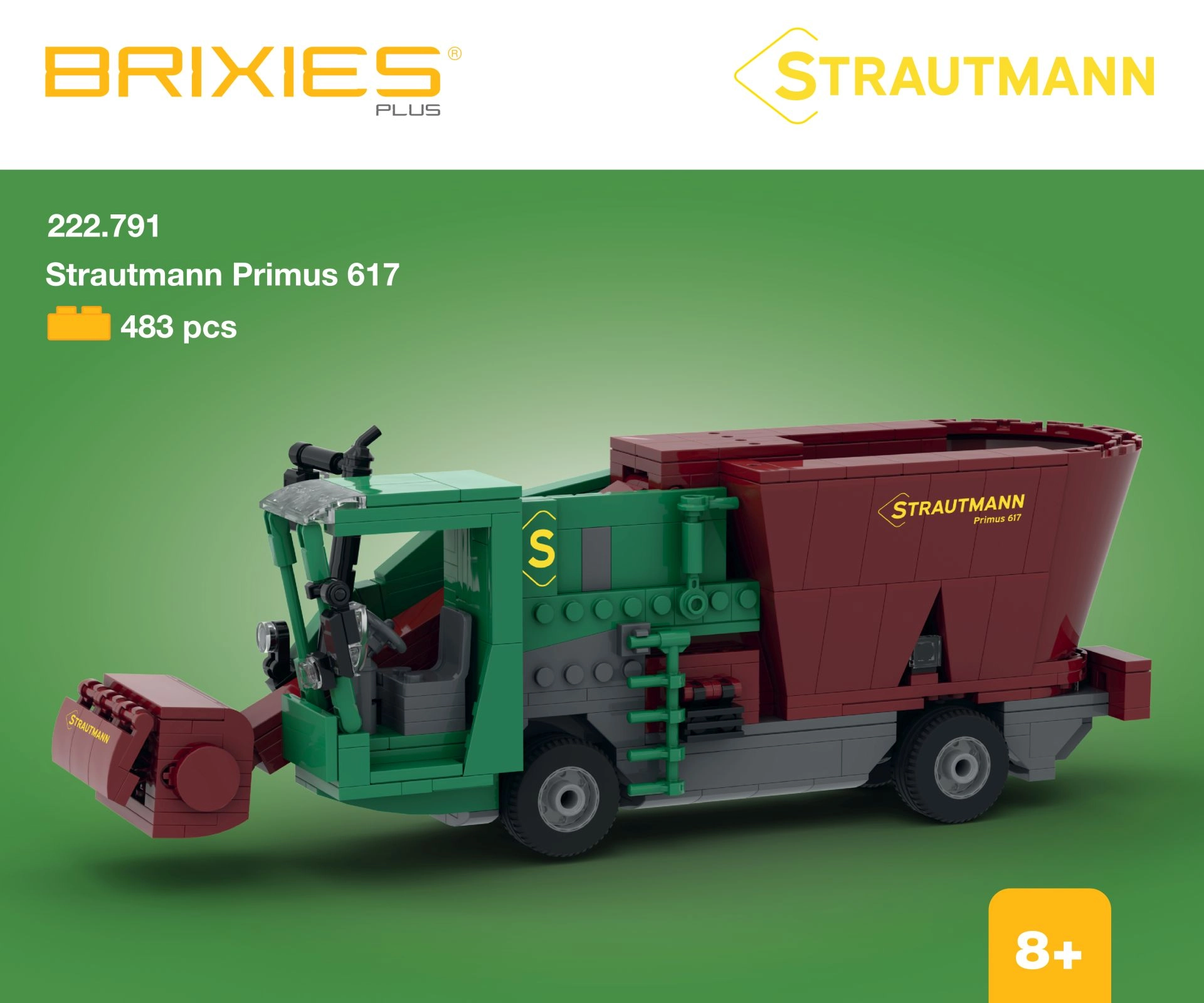 Složite detaljan model miješalice za hranjenje STRAUTMANN PRIMUS 617 iz serije BRIXIES Plus. Set s 483 dijela vjerno prikazuje karakteristične značajke pravog stroja, a nakon sastavljanja mjeri približno 30,2 × 11,6 × 9 cm (d × v × š). Zahvaljujući većim dijelovima prikladan je za djecu od 6–8 godina i kompatibilan je s drugim setovima kocaka sličnog tipa.