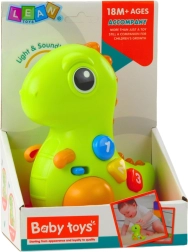 Interaktivni dinosaurus osvojit će djecu na prvi pogled: nakon pritiska šarenih tipki zasvijetli, reproducira melodije i ispušta vesele zvukove. Nježan dodir po nosu pokreće glazbu i kretanje, što potiče razumijevanje veze između dodira i reakcije igračke – sjajna osnova za učenje kroz igru.