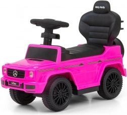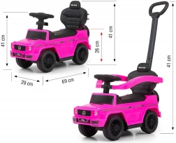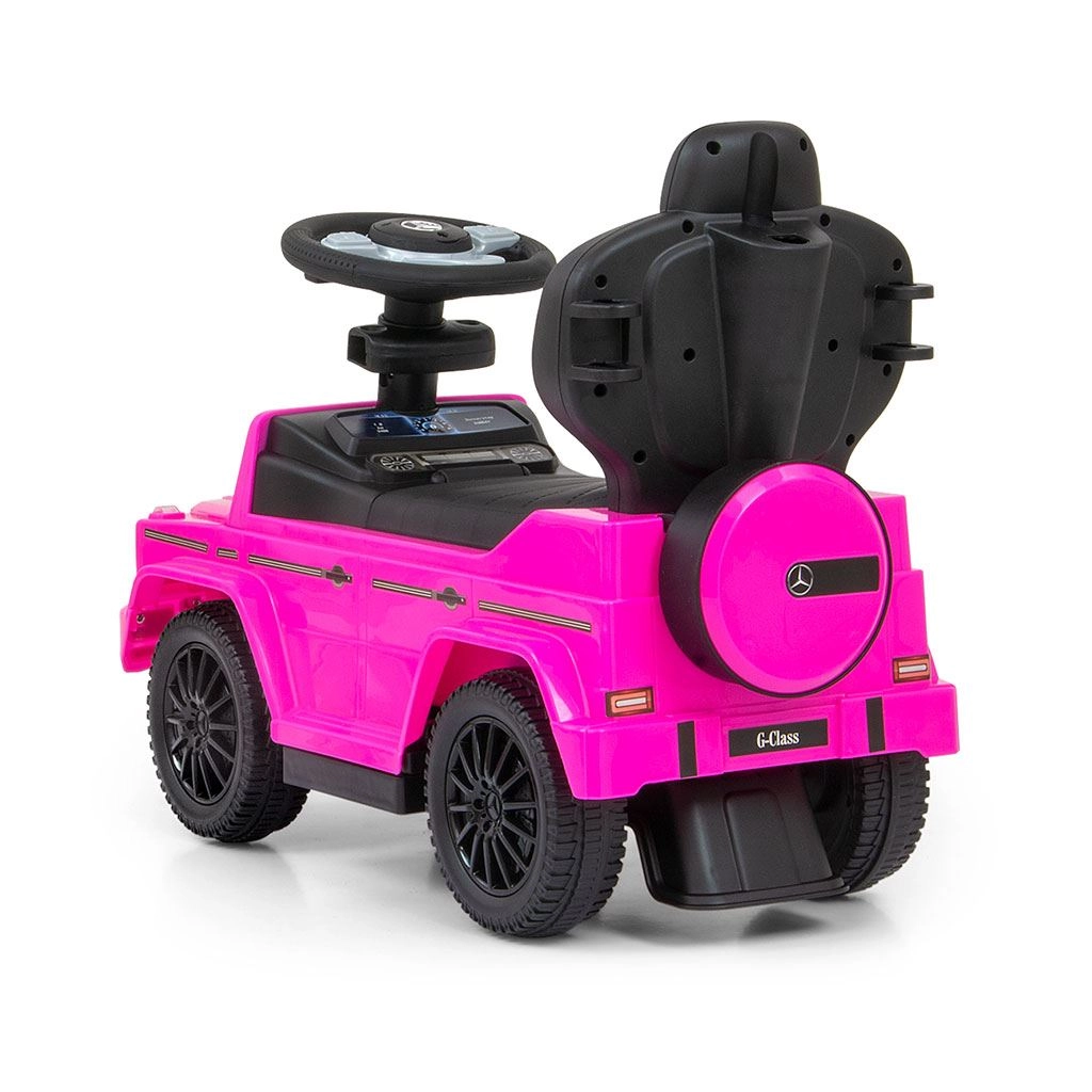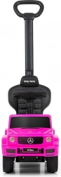 Licencirano guralo MERCEDES G350d u ružičastoj boji izgleda kao pravi terenski automobil i motivira djecu na aktivno kretanje, trenira ravnotežu i motoriku. Zahvaljujući visokom naslonu, bočnim naslonima i vodilici prikladno je za djecu koja već znaju sjediti, ali i za male hodače. Nakon uklanjanja vodilice, naslona za ruke i podnožica pretvara se u klasično guralo.