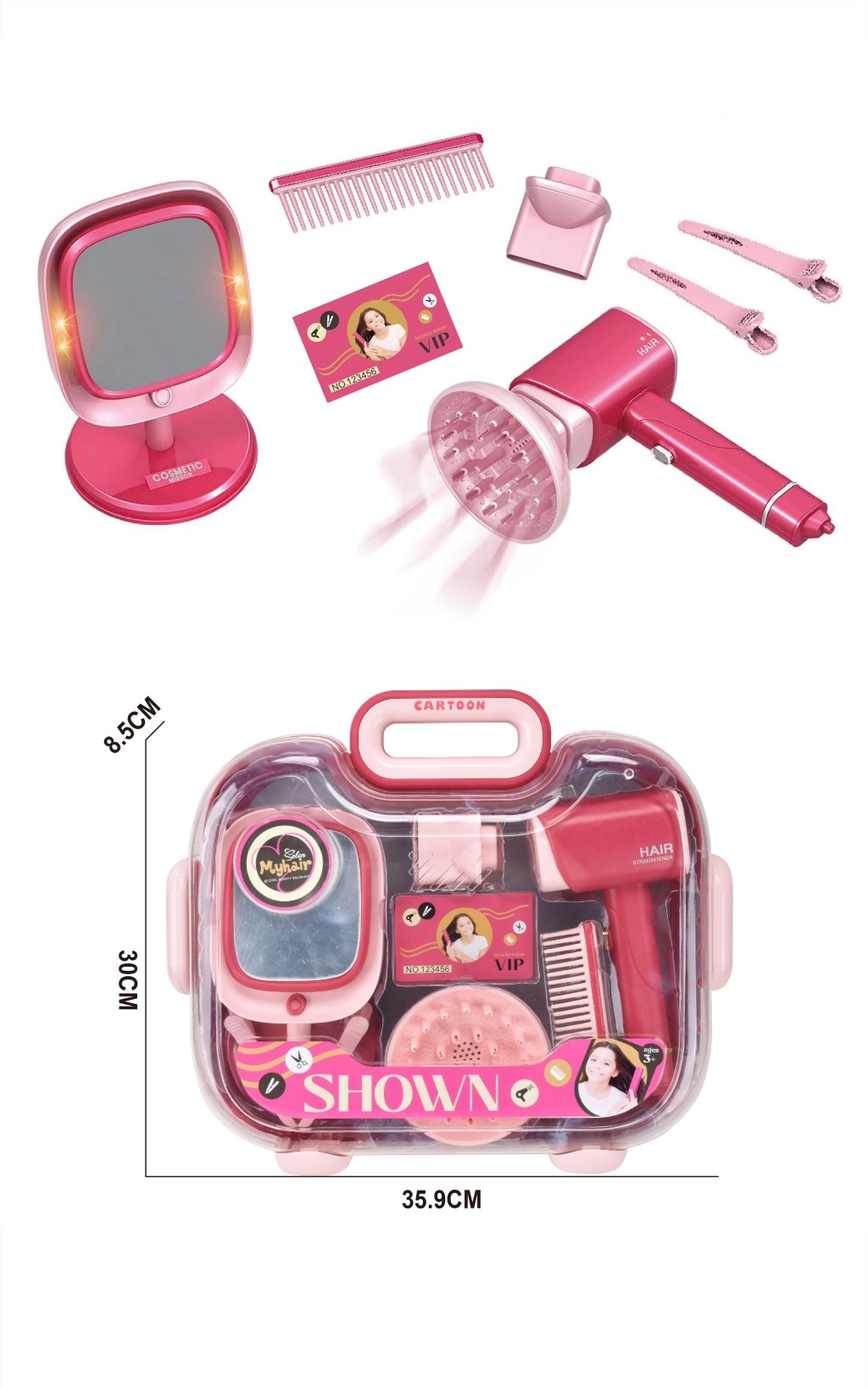 Frizerski studio za djecu sa zrcalom i sušilom zabavan je i bogato opremljen set za male zaljubljenice u uređivanje. Realistično ružičasto sušilo s difuzorom nudi svjetlosne i zvučne efekte, pa djeluje kao pravi frizerski uređaj. Dio seta je i stajaće zrcalo s bočnim osvjetljenjem na stabilnom postolju, u ružičasto‑ljubičastim tonovima.