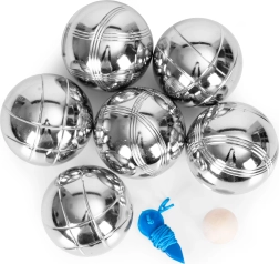 Set sadrži 6 izdržljivih kugli od kromiranog čelika promjera 72 mm i mase oko 700 g za udobno i stabilno bacanje. Dva različita uzorka rebranja olakšavaju razlikovanje kugli u igri. Drveni cochonnet služi kao meta, a mjerna vrpca pomaže pravedno razriješiti sporne situacije.