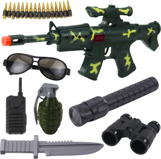 Ovaj cjeloviti vojni set idealan je za djecu koja vole akcijske igre i mise. Realistična plastična puška u zelenom maskirnom dizajnu dobro leži u ruci, a zahvaljujući mehaničkom efektu pucnja igri dodaje na intenzitetu. Dodaci poput dalekozora, voki-tokija, granate i taktičkih naočala omogućuju stvaranje vlastitih priča te razvijanje mašte i fine motorike.