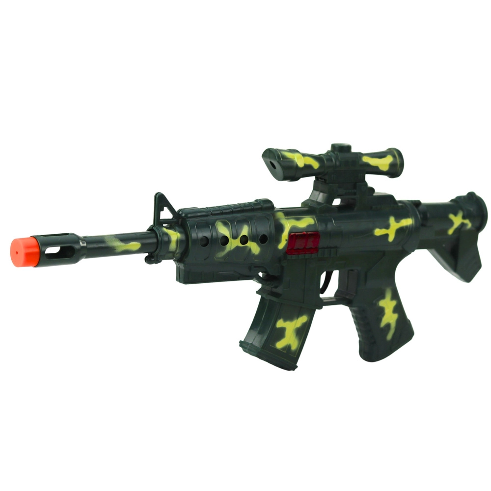 Nakon pritiska na okidač začuje se izražen mehanički efekt pucnja koji pojačava atmosferu igre. Plastična konstrukcija s maskirnim detaljima je lagana i sigurna za djecu.