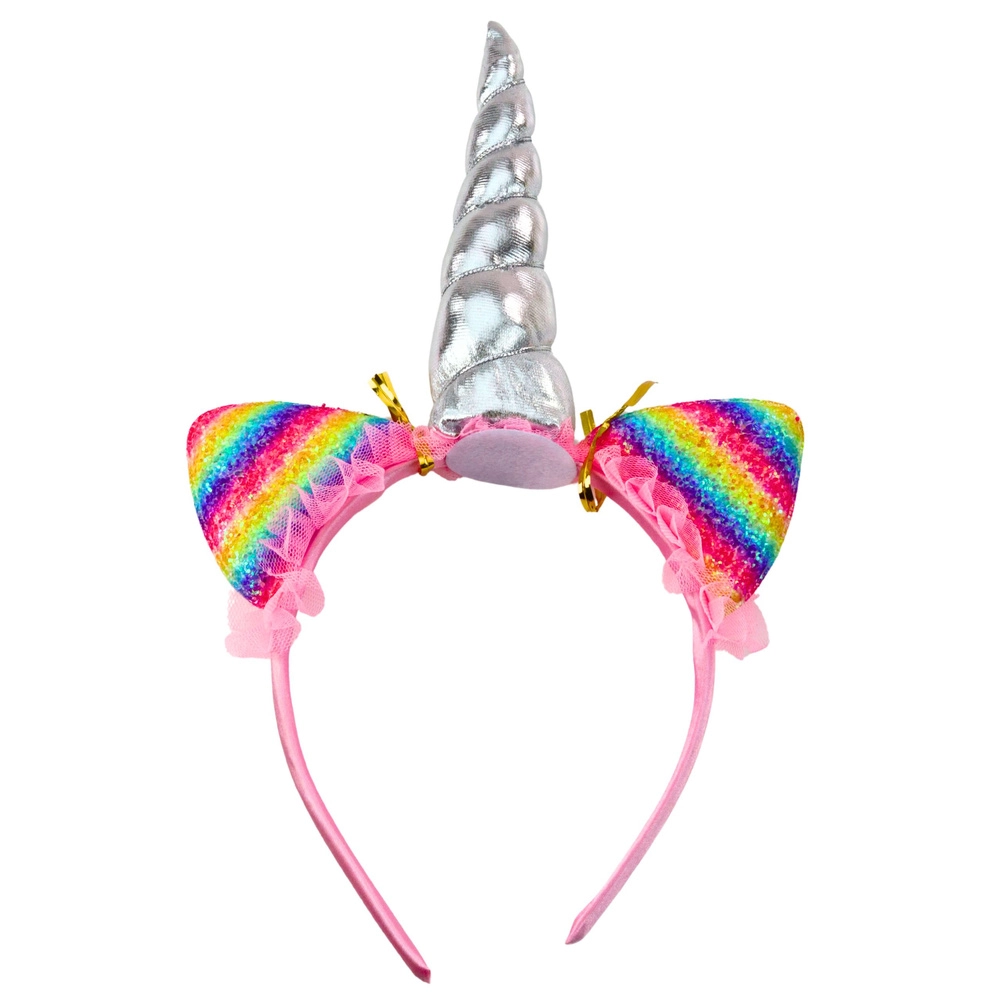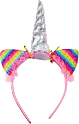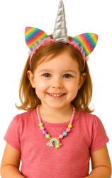 Čarobni set za male ljubitelje bajki: traka za kosu sa svjetlucavim srebrnim rogom i dugino obojanim ušima, dopunjena šarenom ogrlicom od perlica. Idealno za maskiranja, dječje proslave, fotografiranja i kreativnu igru uloga. Laka i udobna traka, elastična ogrlica i pastelne boje sa sjajem stvaraju očaravajući izgled jednoroga.