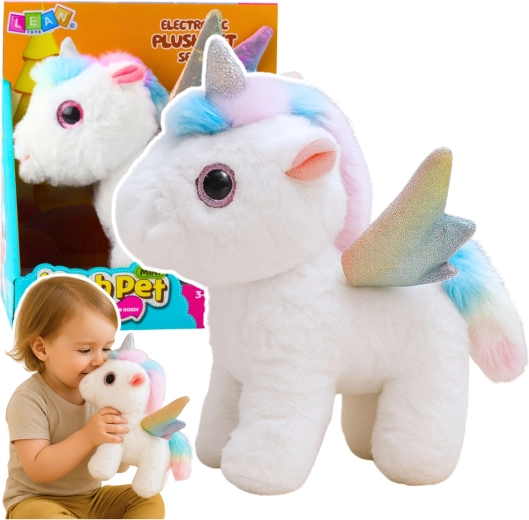 Slatki interaktivni jednorog od mekog pliša razveselit će svako dijete. Nakon uključivanja kreće se naprijed i proizvodi zvučne efekte, ima sjajni rog, duginu grivu i rep te blistava krila. Idealan za maštovitu igru i maženje.