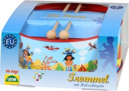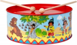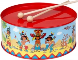 Dječji bubanj s indijanskim uzorkom promjera 20 cm oduševit će male glazbenike. Izrađen je od metala, dopunjen tkaninom i dvjema drvenim palicama. Dio pakiranja je i uzica za vješanje oko vrata. Podržava razvoj koordinacije, ritma i ljubavi prema glazbi.