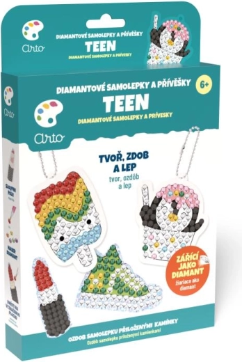 Pretvorite ideje u blještave dekoracije! Kreativni set ARTO omogućuje djeci lako stvaranje originalnih privjesaka i naljepnica. Dovoljno je slijediti predložak, lijepiti sitne “dijamante” na označena mjesta i u trenu će nastati sjajni uradci koji će ukrasiti ruksak, pernicu ili poslužiti kao lijep poklon.