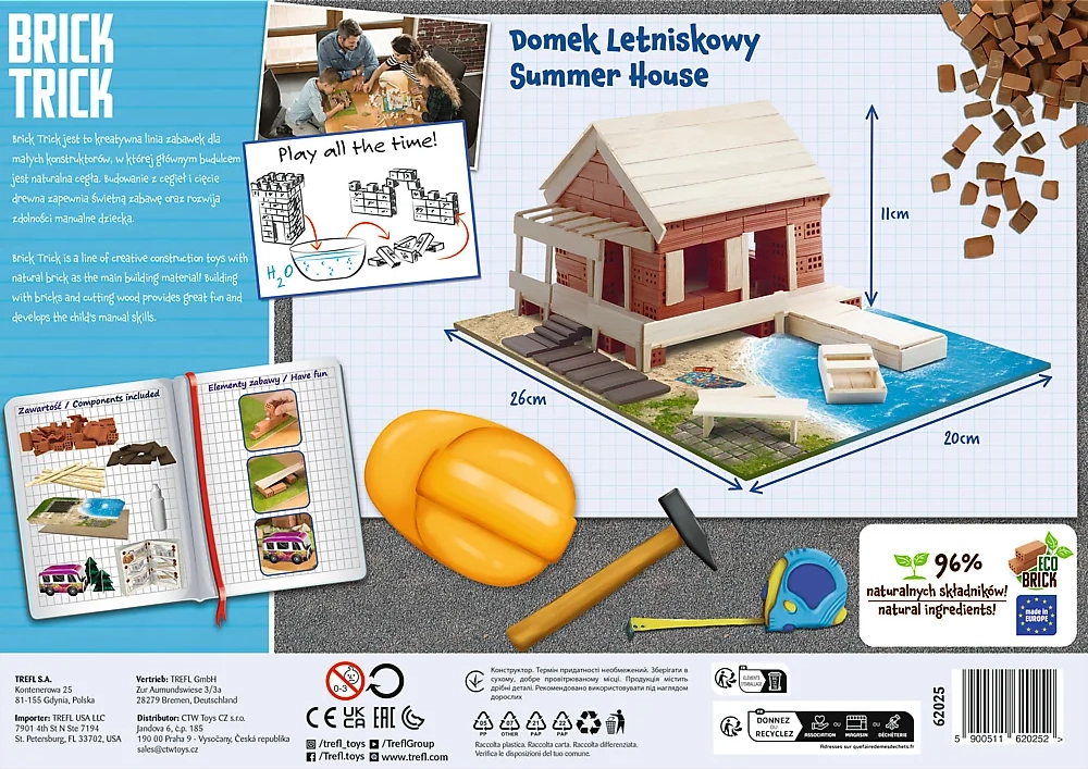 Zahvaljujući u vodi topivom ljepilu set se može koristiti više puta – model lako rastavite, ciglice očistite i možete započeti novi projekt. Kombiniranjem više setova TREFL Brick Trick stvorit ćete slikovito selo, moderan grad ili srednjovjekovno naselje.