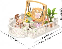 Realistična ljuljačka s jastukom, stolić sa suncokretima i cvijeće stvaraju ugodno mjesto za odmor i izlaganje detalja.