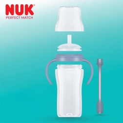Praktični indikator temperature mijenja boju ako je napitak previše vruć te tako pomaže roditeljima u sigurnom posluživanju. Bočica je dio sustava NUK Perfect Match i kompatibilna je s drugim priborom iz ove linije kako bi se prilagodila potrebama rastućeg djeteta.