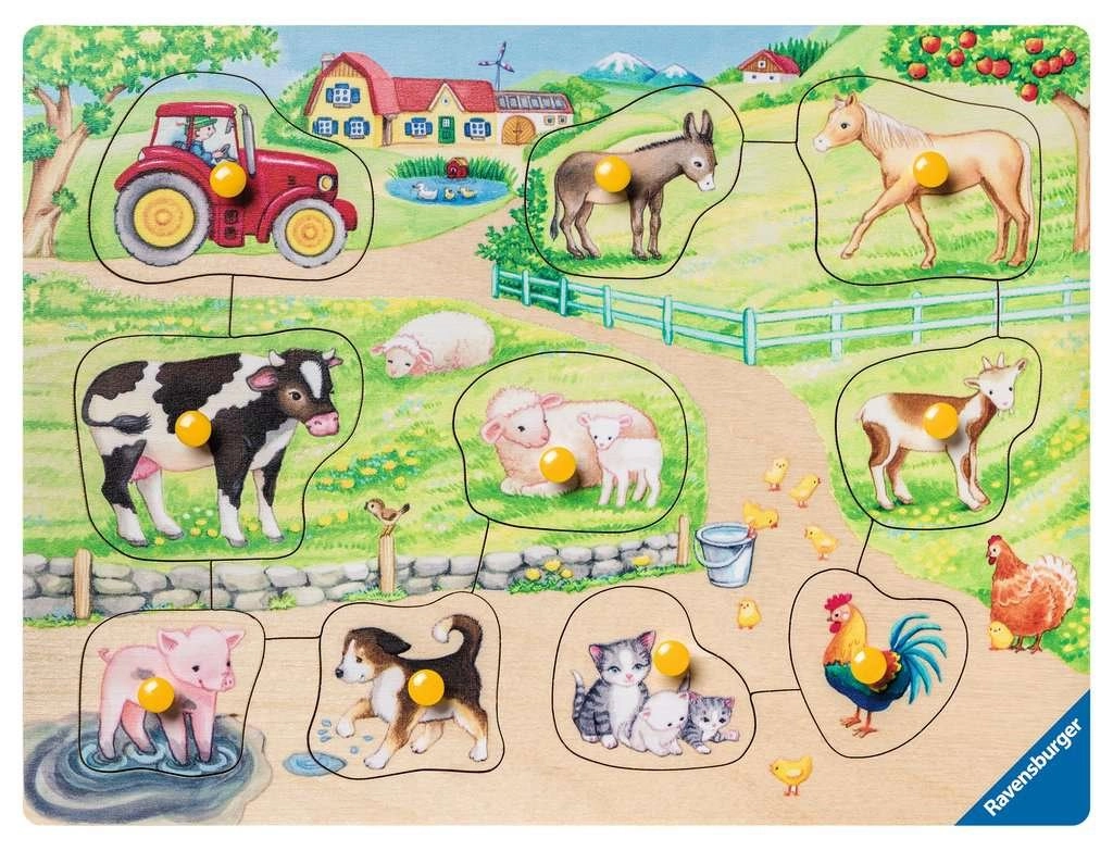 Drvena umetaljka Ravensburger iz linije Moje prve drvene puzzle donosi djeci radost učenja kroz igru. Deset čvrstih dijelova s ljubavlju ilustriranim motivima s farme pomaže razvijati ključne vještine i podupire pravilan hvat zahvaljujući plastičnim ručkicama na svakom dijelu.