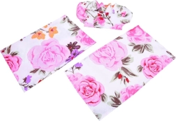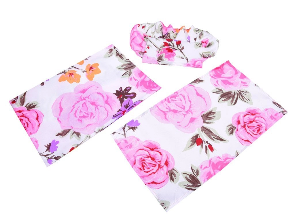 Uključeni su mekani jastučić i deka s šarenim cvjetnim uzorkom – sve usklađeno i spremno za lutke i plišance.