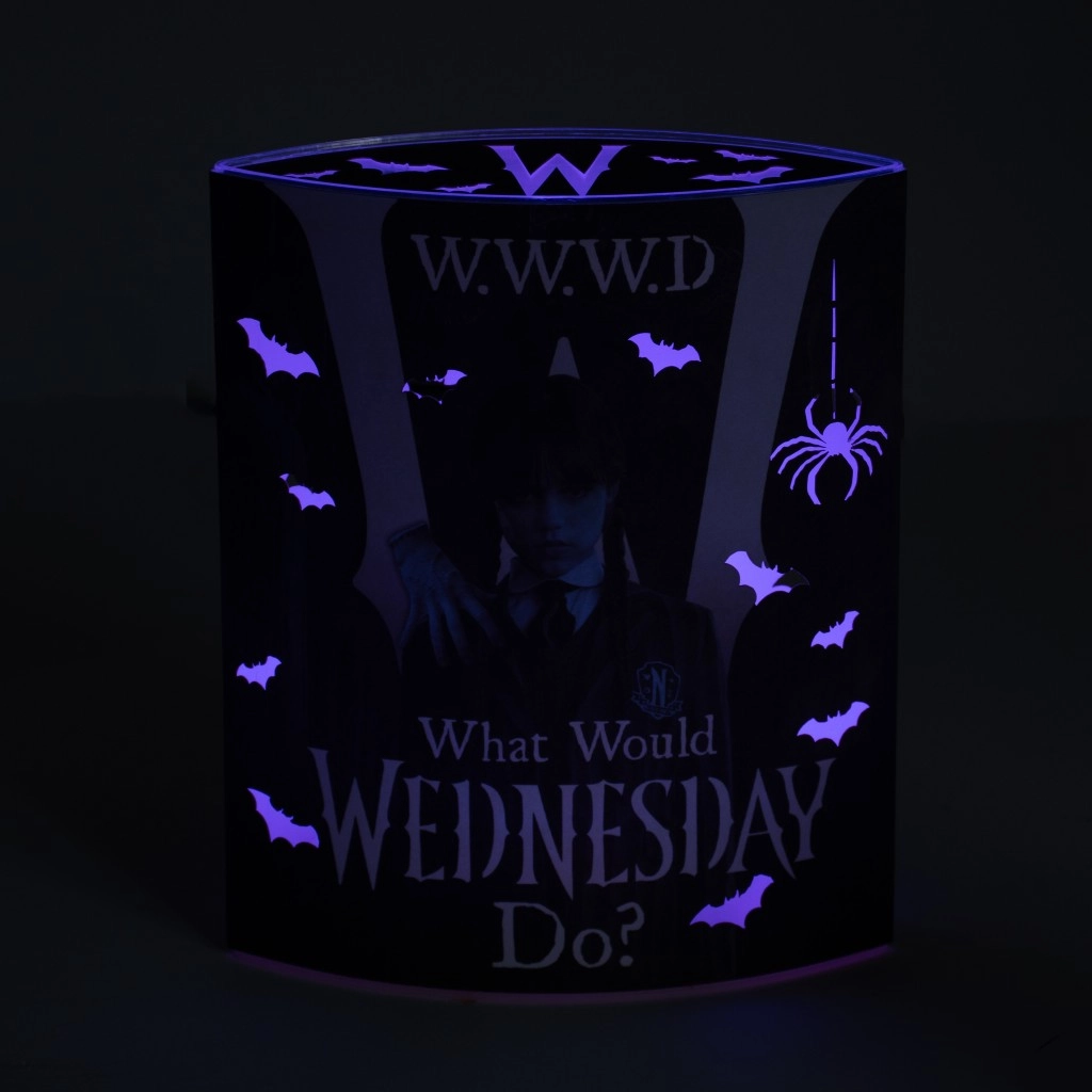 Dizajnerska lampa s motivom plesne Wednesday savršen je dodatak za obožavatelje gotičke estetike i serije WEDNESDAY. Izrezi u obliku šišmiša i blago difuzno svjetlo stvaraju dojamnu atmosferu u spavaćoj sobi, dnevnom boravku i radnom prostoru. Zahvaljujući kompaktnih 17 × 14 × 6 cm lako stane na noćni ormarić, policu ili stol.