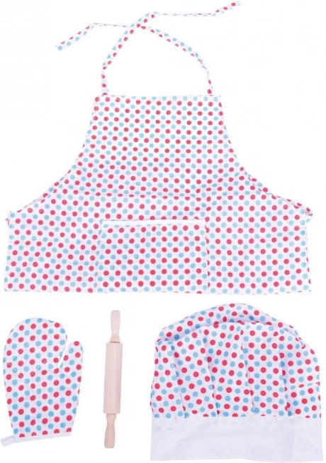 Ugodna pregača s raznobojnim točkicama štiti odjeću tijekom igre i pravog pečenja. Podesiva kapa na čičak lako se prilagođava opsegu glave i udobno stoji cijeli dan.