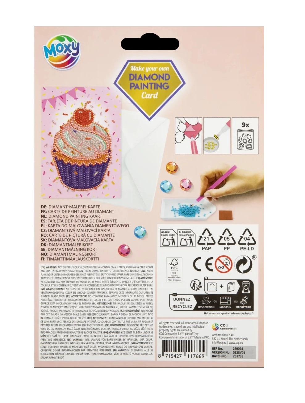 - Predložak/slika s brojevima, više vrsta dijamanata/kamenčića, aplikacijska olovka, ljepljivi jastučić, tacna, kuverta