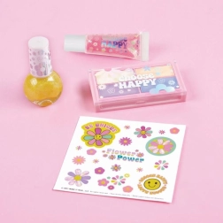 Paleta s četiri boje sjenila omogućuje kombiniranje nijansi prema raspoloženju, lak za nokte i sjajilo za usne daju izgledu nježan šarm. List naljepnica proširuje mogućnosti ukrašavanja i potiče kreativnost.