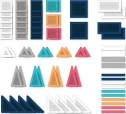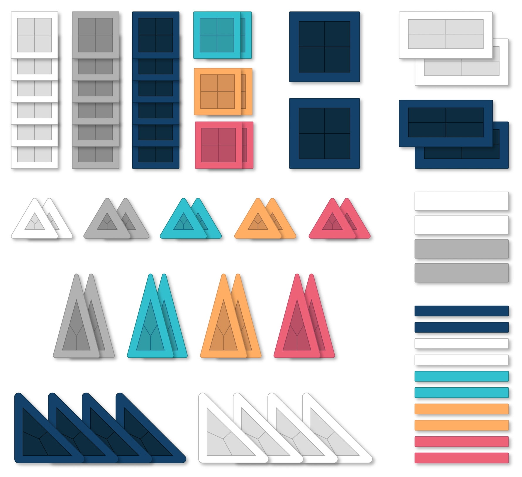 - 24 mala kvadrata, 10 malih jednakostraničnih trokuta, 8 pravokutnih trokuta, 8 jednakokračnih trokuta, 2 velika kvadrata, 3 pravokutnika, 4 duga pravokutnika, 10 „linija“ (pravokutnika), ilustrirana knjižica