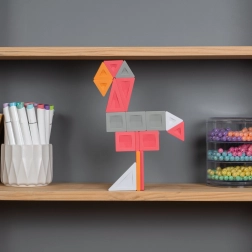 - Sadržaj seta (70 kom): 24 mala kvadrata, 10 malih jednakostraničnih trokuta, 8 pravokutnih trokuta, 8 jednakokračnih trokuta, 2 velika kvadrata, 3 pravokutnika, 4 duga pravokutnika, 10 „linija“ (pravokutnika) + ilustrirana knjižica s inspiracijama.