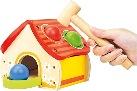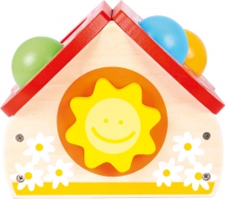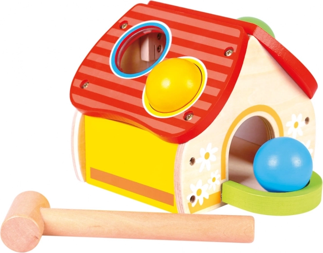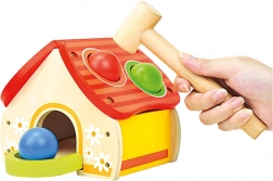 Ova kvalitetna drvena igračka u obliku vesele kućice privlači djecu živim bojama i jednostavnim principom igre – loptice se umeću u otvore na krovu i nježno zabijaju čekićem. Zabava potiče razvoj motorike, strpljenje i preciznost.