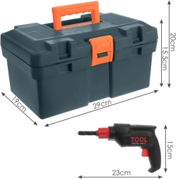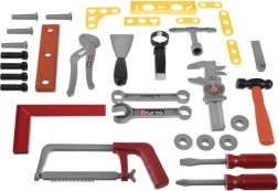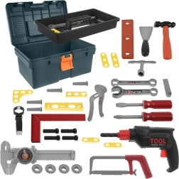 Sadržaj seta: kofer, čekić, ravni i križni odvijač, pokretna ručna pila, okasti ključ, podesivi ključ, viljuškasti ključ, nasadni ključ, pomično mjerilo (šubler), libela, kutnik, špahtla, turpija, spojni elementi, letvice, vijci i matice. Bušilica ima rotirajuće svrdlo bez potrebe za baterijama, pa je igra glatka i jednostavna za razumjeti.