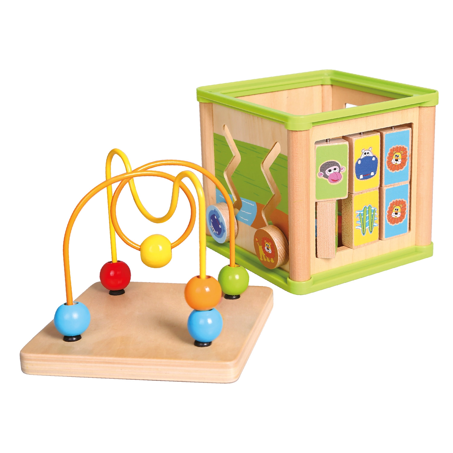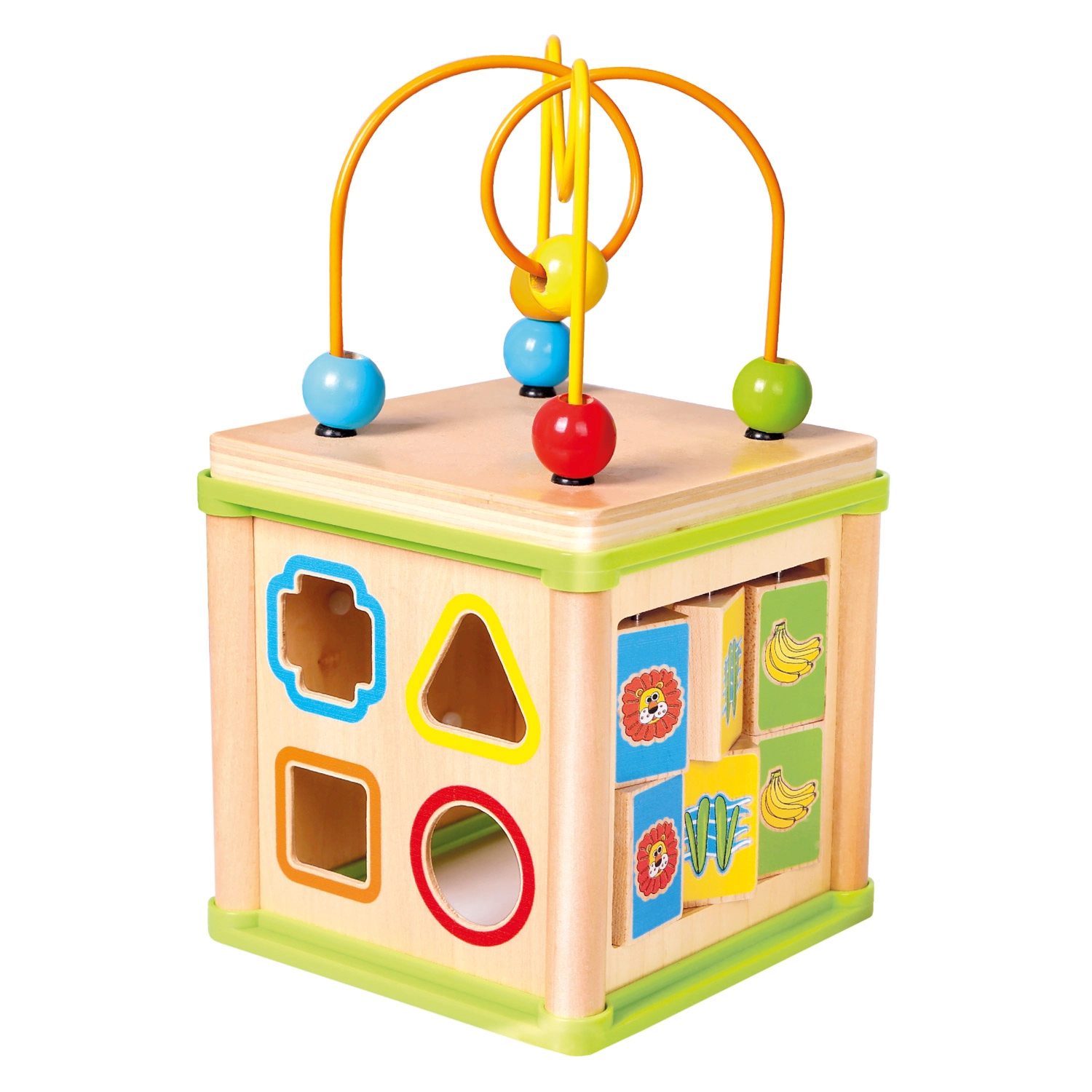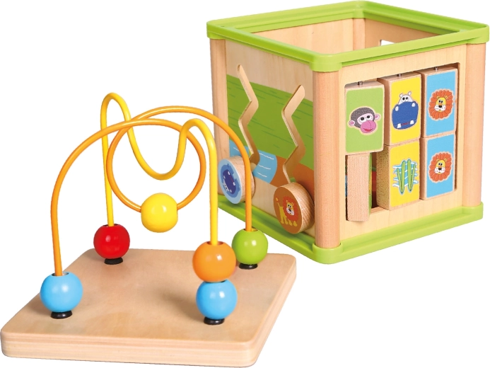 Ova svestrana drvena aktivna kocka kombinira pet atraktivnih igraćih elemenata u jednom kompaktnom izdanju. Djeca mogu povezivati životinje s njihovom hranom, provlačiti perlice po krivudavim stazama, istraživati funkciju zupčanika ili vježbati umetanje oblika. Gornji dio čini labirint s perlicama, koji potiče koordinaciju oko–ruka i usredotočenost.