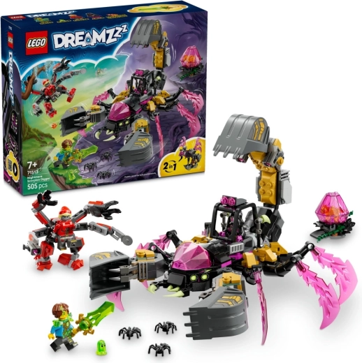 LEGO DREAMZzz Škorpionska rovokopačnica iz noćnih mora donosi djeci mogućnost izbora: izgradite zastrašujućeg škorpiona s velikim kliještima i rovokopačem na repu ili elegantnu biomehaničku osu s kristalnim krilima i otrovnim žalcem. Zahvaljujući upečatljivim ružičastim prozirnim “kristalima”, model na prvi pogled privlači pažnju i poziva na akcijsku igru.