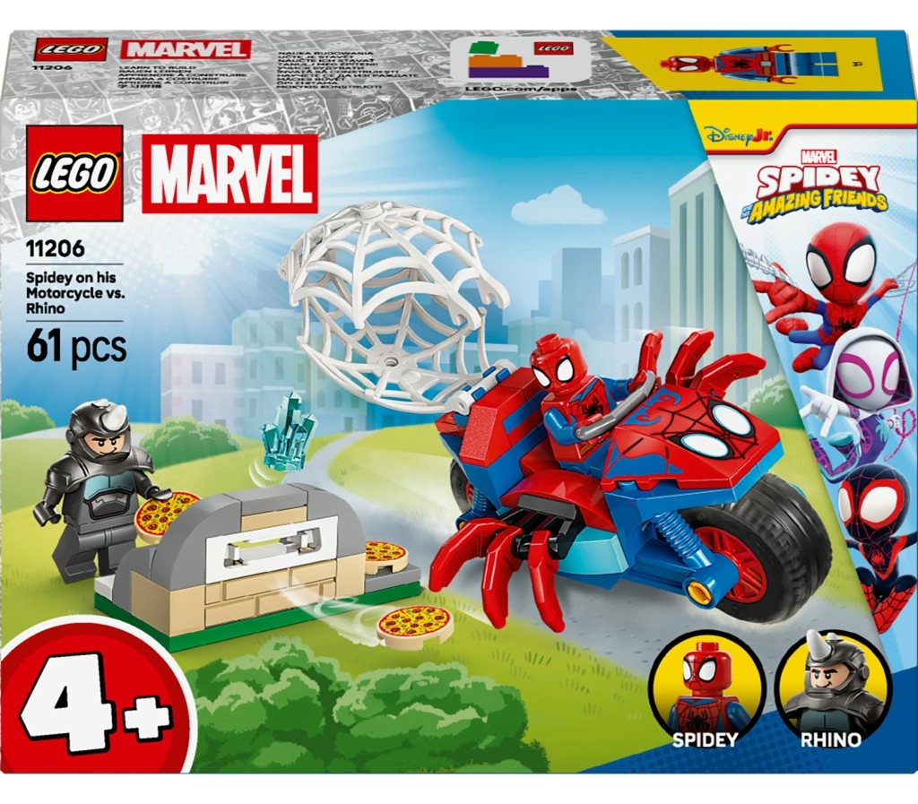 Ovaj šareni set donosi akcijske potjere i humor – Spidey na crveno-plavom motoru s paukovim detaljima progoni Rhina, koji ispaljuje leteće kriške pizze iz vlastite peći. Djeca će uživati u lakom slaganju, mnoštvu dodataka i mogućnosti uhvatiti Rhina u mrežu.