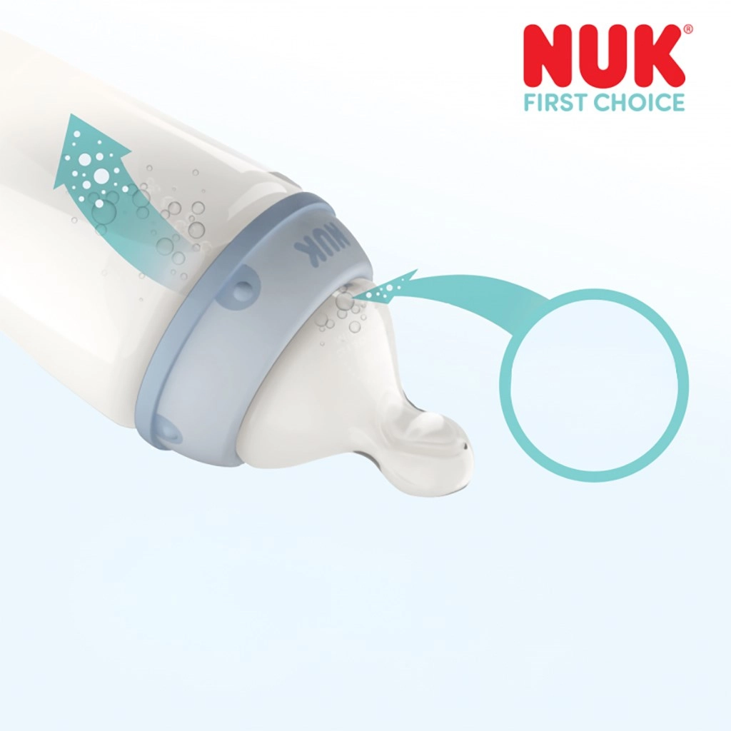 Nastavak – dudlica NUK First Choice+ Flow Control dizajniran je tako da se prilagodi tempu vaše bebe. Inovativni otvor u obliku Y otvara se samo pri sisanju, a njegova se širina mijenja ovisno o intenzitetu, tako da tekućina teče točno onoliko brzo koliko djetetu treba – bez obzira je li napitak rjeđi ili gušći. Dio je i pouzdan antikolični sustav koji minimalizira gutanje zraka i pridonosi mirnom trbuščiću.
