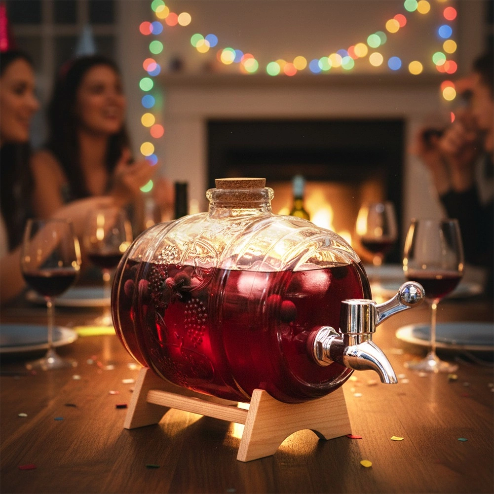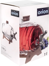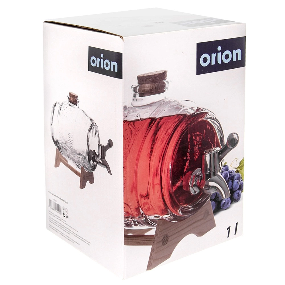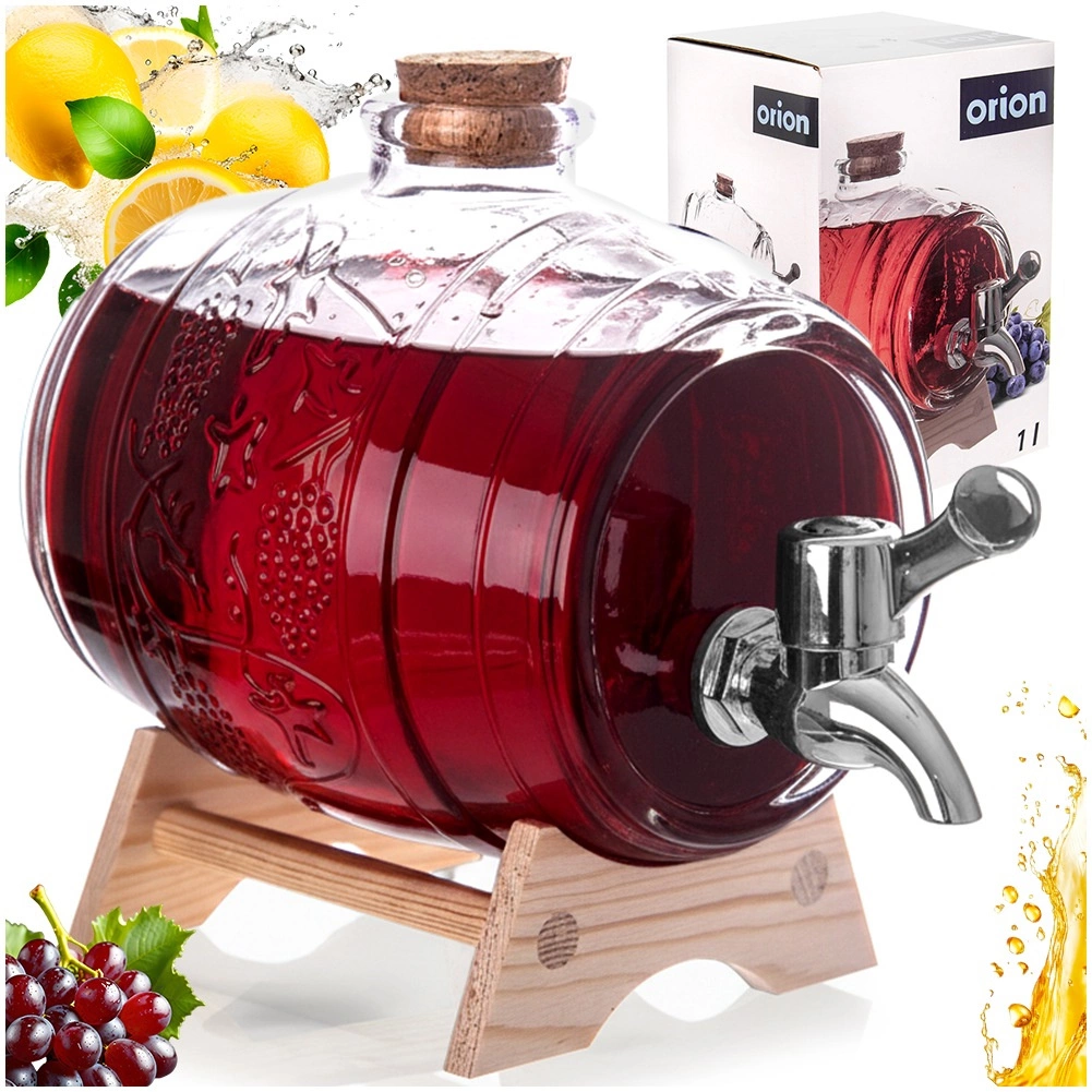 Stilni stakleni posudač za napitke zapremnine 1 l s drvenim stalkom, metalnim pipcem i prirodnim čepom od pluta. Idealan za limunade, punče, sokove i domaća vina na vrtne zabave i obiteljska okupljanja. Debelo staklo s dekorativnim reljefom u obliku bačvice osigurava izdržljivost i atraktivan izgled.