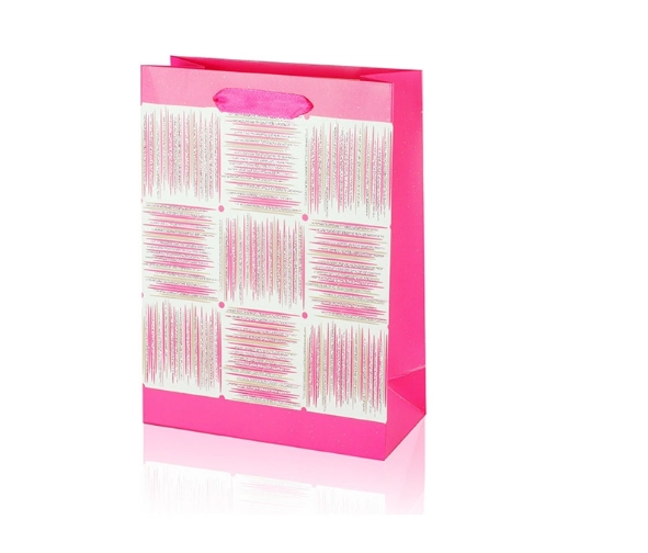 Stilska poklon-vrećica veličine A5 za elegantno pakiranje manjih darova. Dostupna u četiri boje sa sjajnim, svjetlucavim uzorkom i čvrstim vrpcama za udobno nošenje. Čvrsta izrada, sjajna površina i praktične dimenzije čine je idealnim izborom za svaku prigodu.