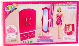 Elegantni set namještaja za lutke visine oko 29 cm uključuje garderobni ormar s vratima na otvaranje i ladicama, samostojeće ogledalo sa stabilnom bazom i set vješalica. Izdržljivo plastično izvedenje, privlačna ružičasto-bijela kombinacija i detalji za kreativnu igru i organizaciju odjeće.